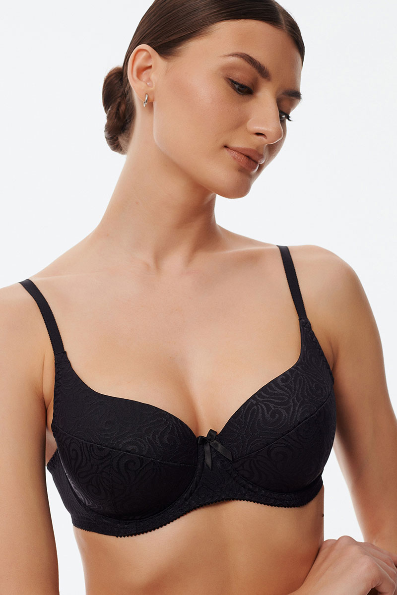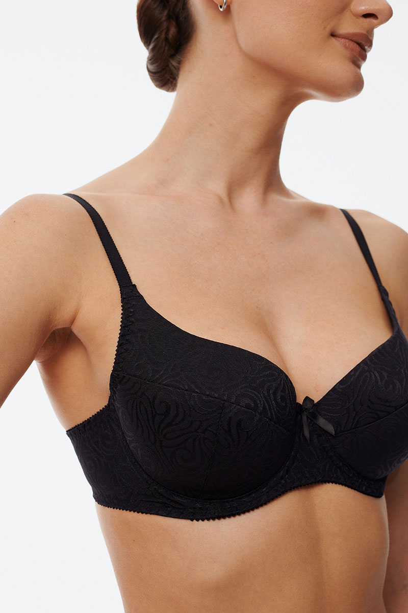 Бюстгальтер с глубокой чашкой на основе из тонкого поролона, полностью обтянут микрофиброй. В модели присутствуют каркасы («косточки»). Бретели регулируются по длине, но не отстегиваются.