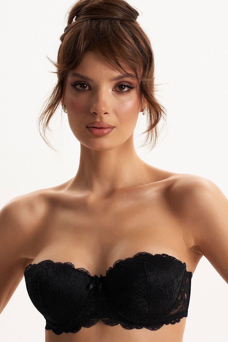 Бюстгальтер «балконет» формованный (без эффекта «пуш-ап»). Чашка декорирована эластичным кружевом. В модели присутствуют каркасы («косточки»). Бочки из эластичного трикотажного полотна (микрофибра) наполовину кружевные. Бретели съёмные, регулируются по длине.