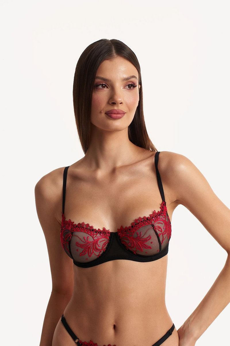 Бюстгальтер из вышивки и сетчатого полотна на каркасах. Чашка мягкая с вертикальным швом. В боковом шве - пластины. Застёжка на крючки и петли сзади.