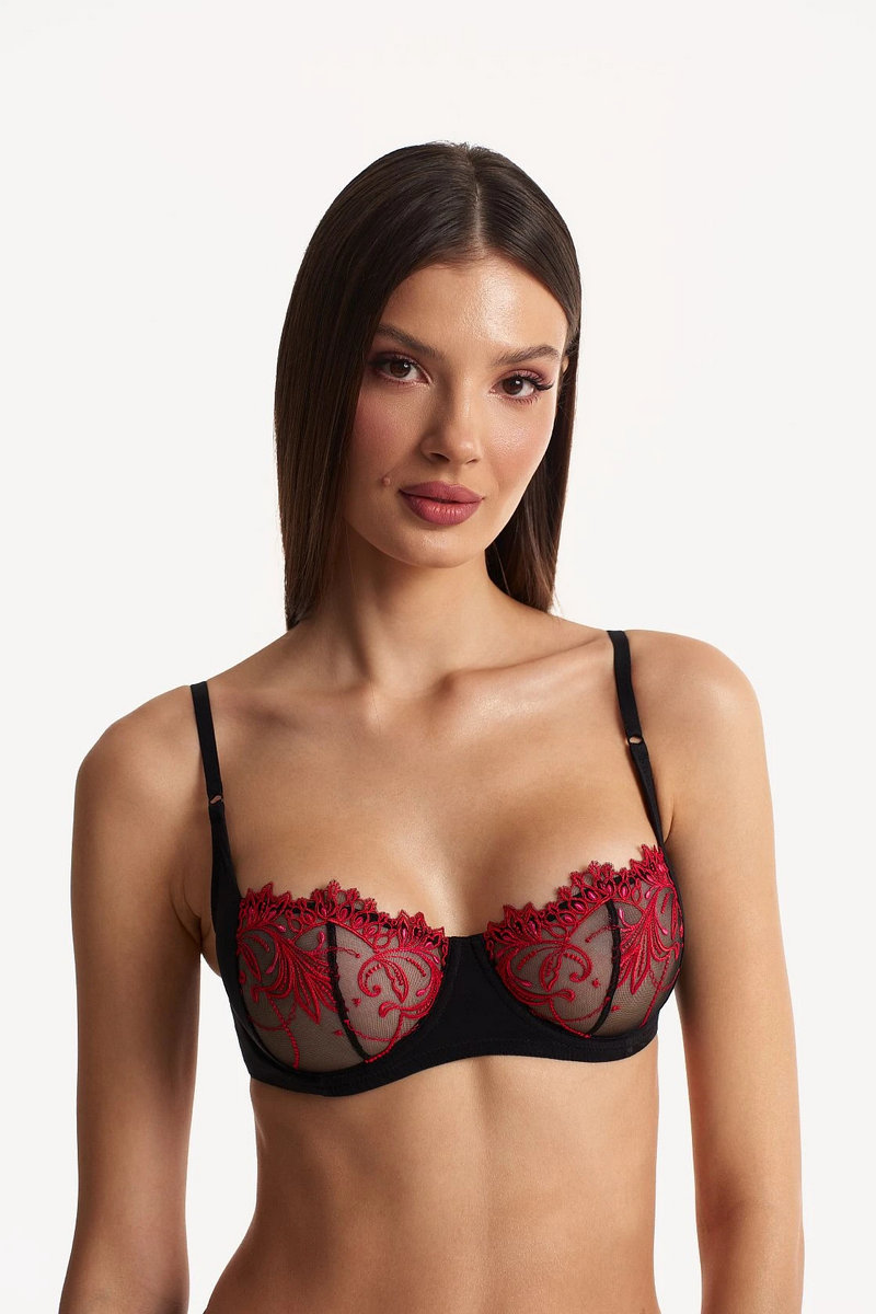 Бюстгальтер с мягкой чашкой на каркасах. Выполнен из эластичного полотна и вышивки.