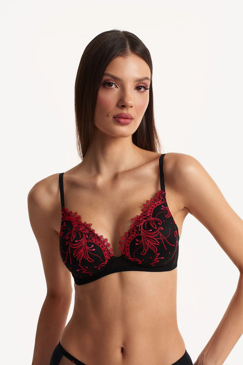 Бюстгальтер с тонкой формованной чашкой, без каркасов, из эластичного кружева и эластичного полотна для группы средних размеров.