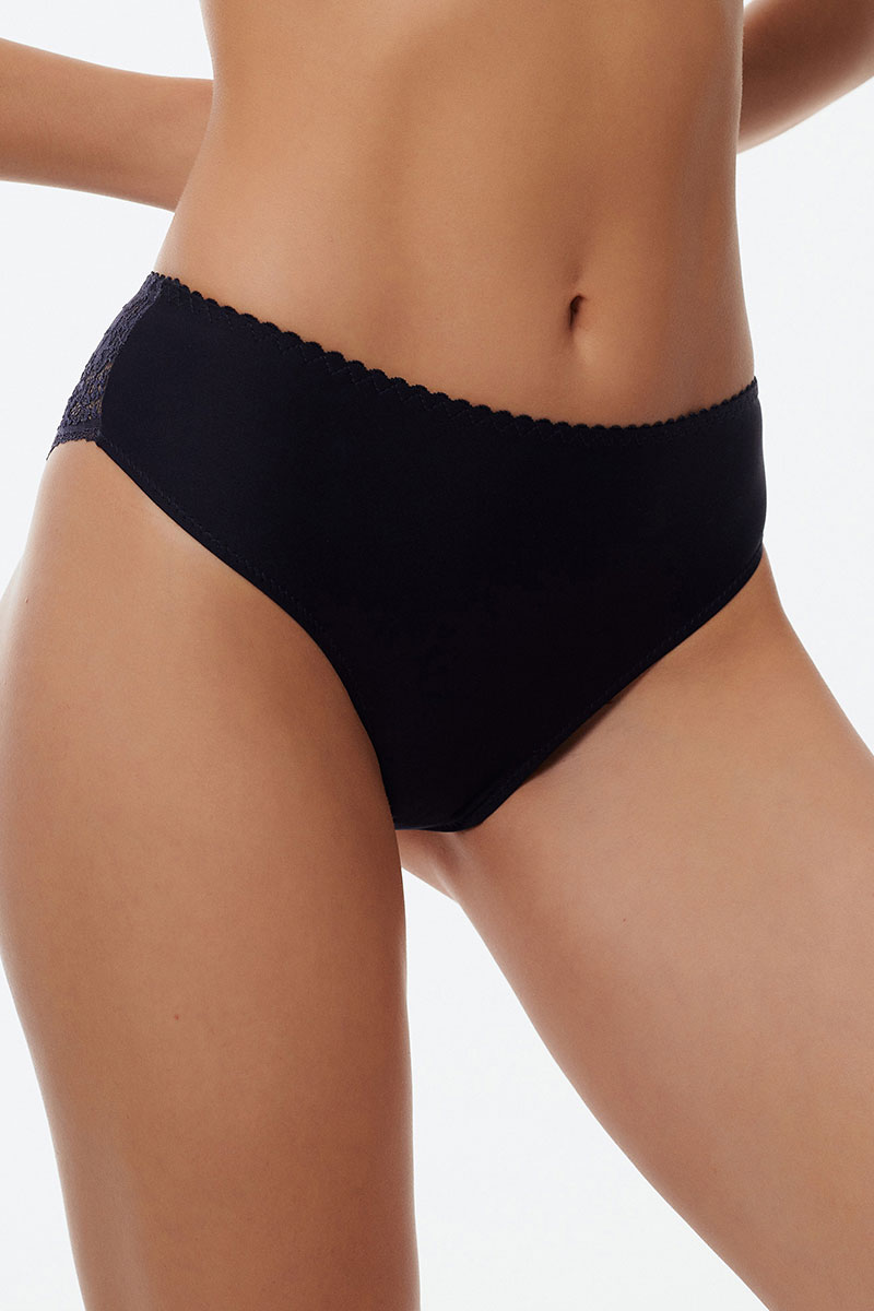 Трусы с высокой линией талии из эластичного трикотажного полотна (микрофибра). Задняя деталь полностью из эластичного кружева. Подкладка ластовицы из 100% х/б.