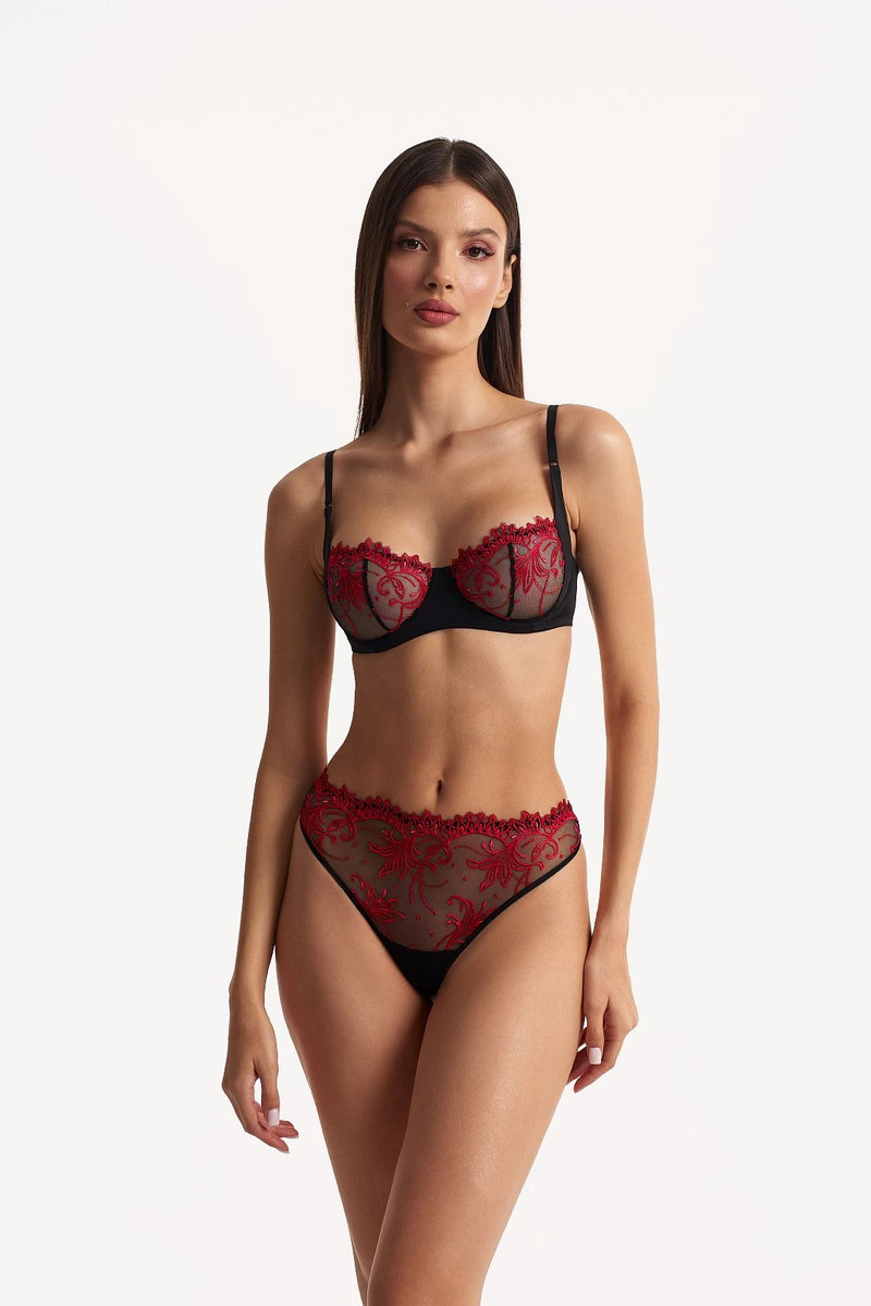 Трусы бразилиана высокой посадки, выполнены из эластичного кружева и эластичного полотна.