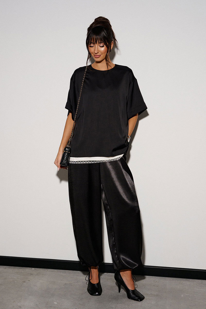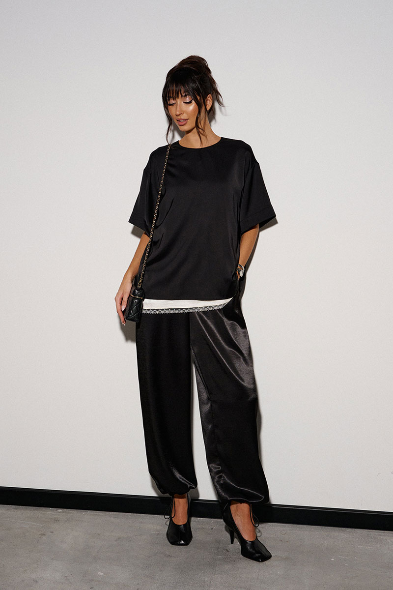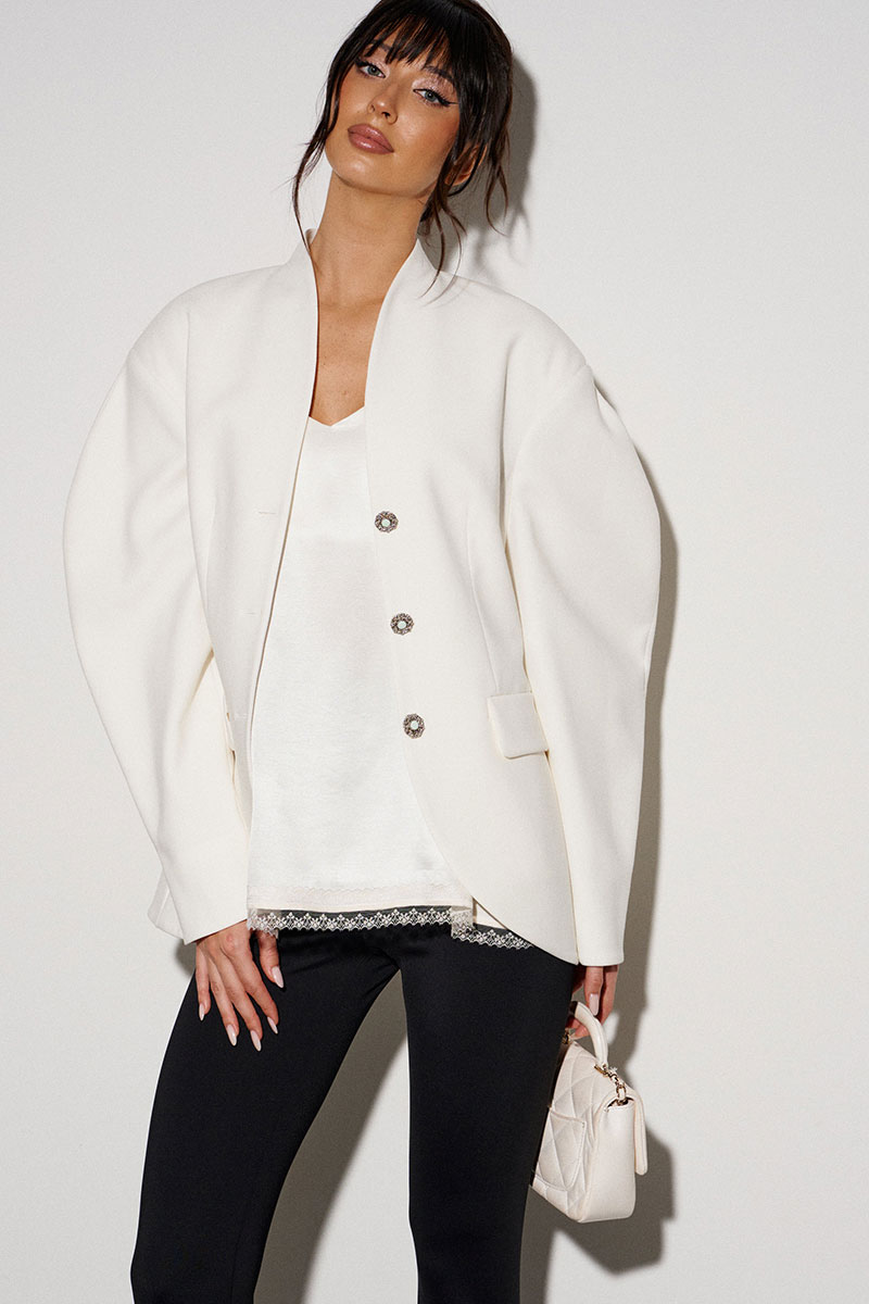 Блузон в крое трапеция, выполнен из струящейся ткани молочного цвета. Характеристика: крой трапеция - расширяется к низу, широкие бретели, спереди v-образный вырез, по спинке овальная горловины, спинка изделия чуть удлиненна, по низу изделия белое кружево, хлопковая подклада в виде топа на резинке.