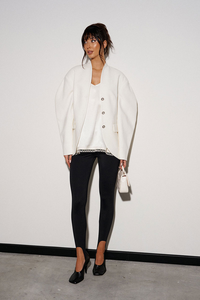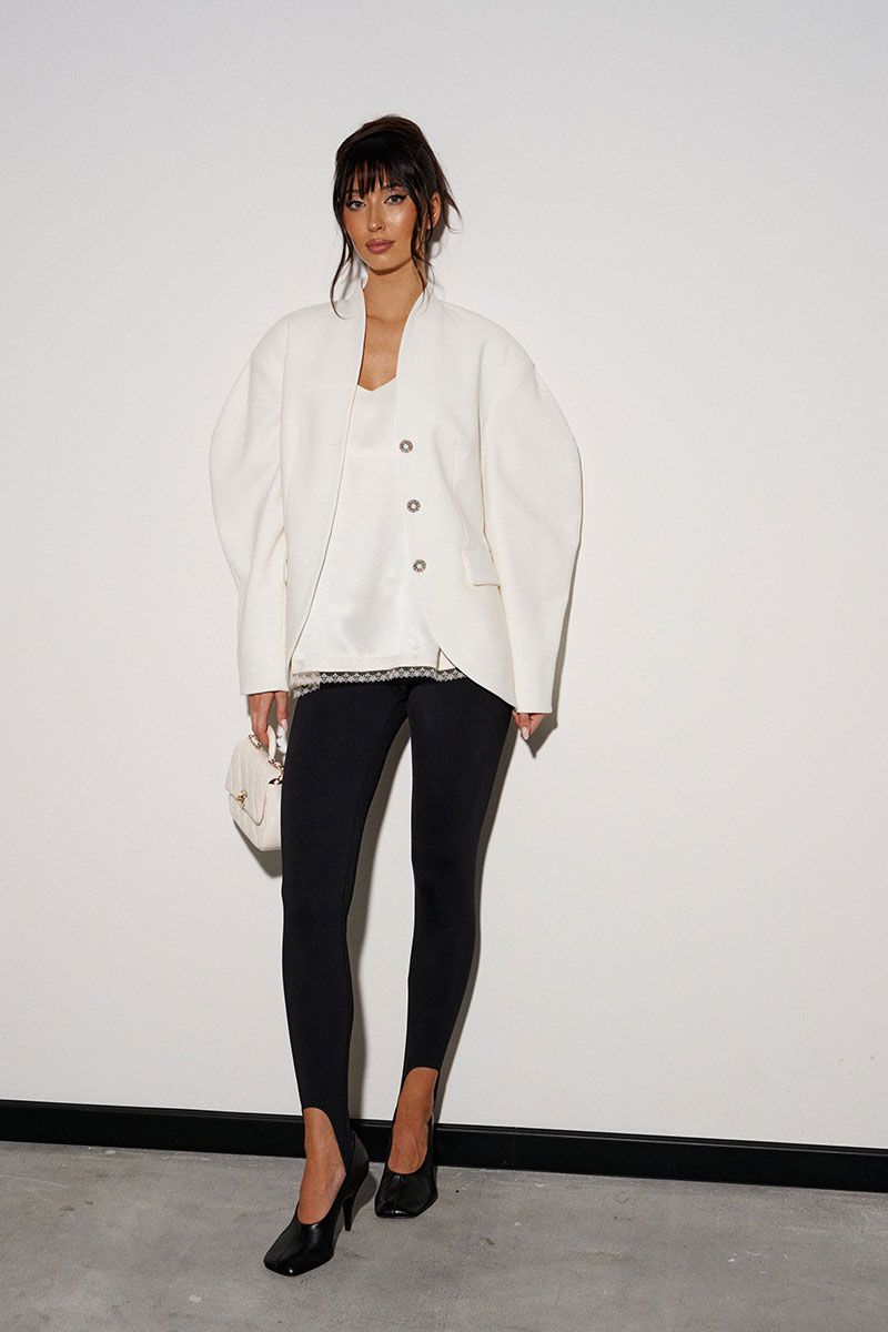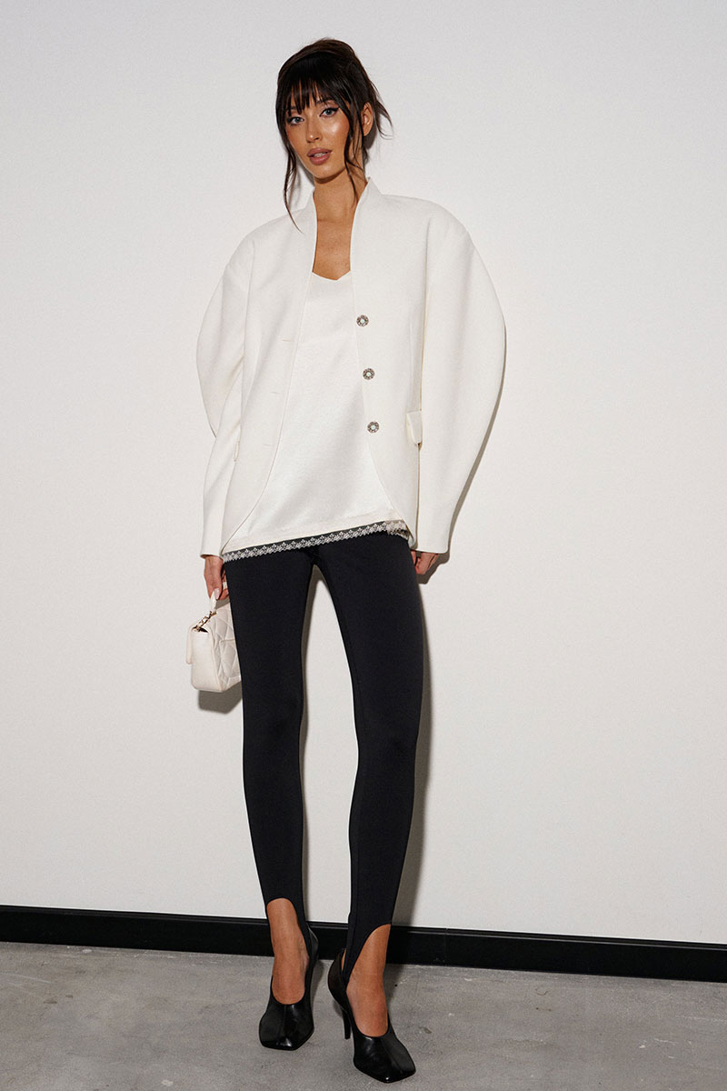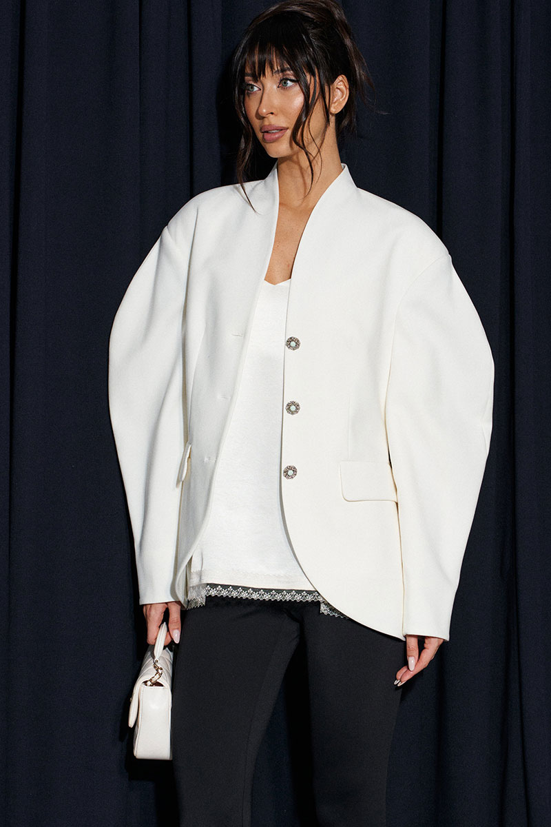 Блузон в крое трапеция, выполнен из струящейся ткани молочного цвета. Характеристика: крой трапеция - расширяется к низу, широкие бретели, спереди v-образный вырез, по спинке овальная горловины, спинка изделия чуть удлиненна, по низу изделия белое кружево, хлопковая подклада в виде топа на резинке.
