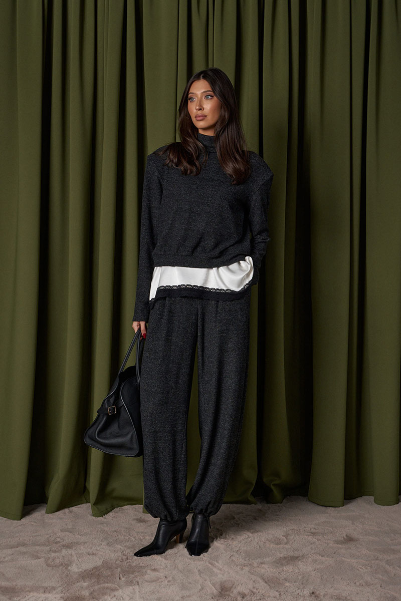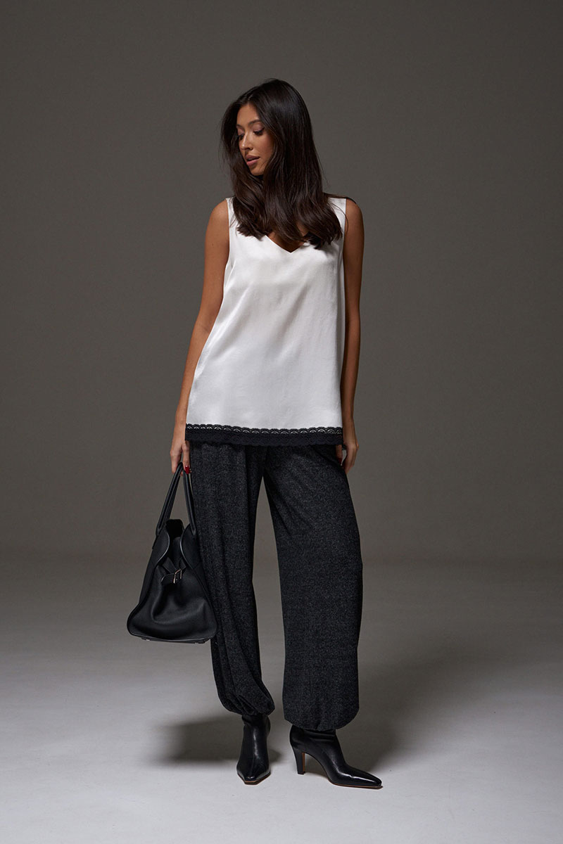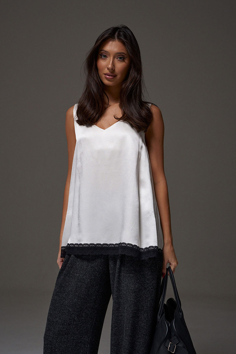 Блузон в крое трапеция, выполнен из струящейся ткани молочного цвета. Характеристика: крой трапеция - расширяется к низу, широкие бретели, спереди v-образный вырез, по спинке овальная горловины, спинка изделия чуть удлиненна, по низу изделия черное кружево.