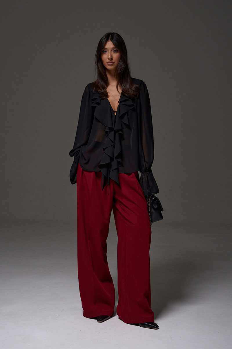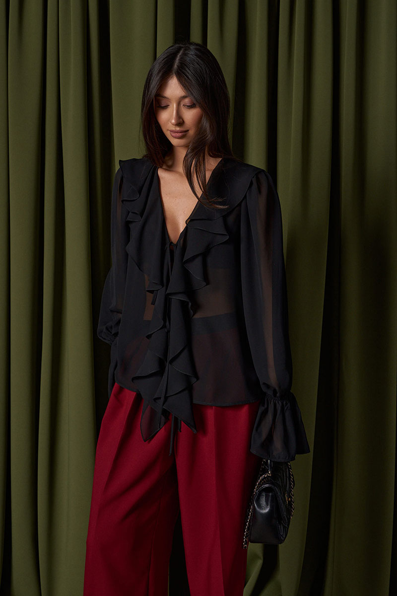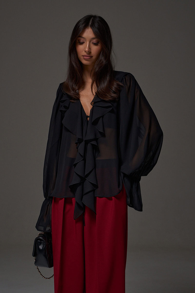 Блузка из текстильного прозрачного полотна черного цвета. Характеристика: свободный крой, горловина V-образная, с притачной рюшей по всей длине горловины и борта, застежка на шнурки-завязки, рукав втачной, притачной манжетой в виде волана.