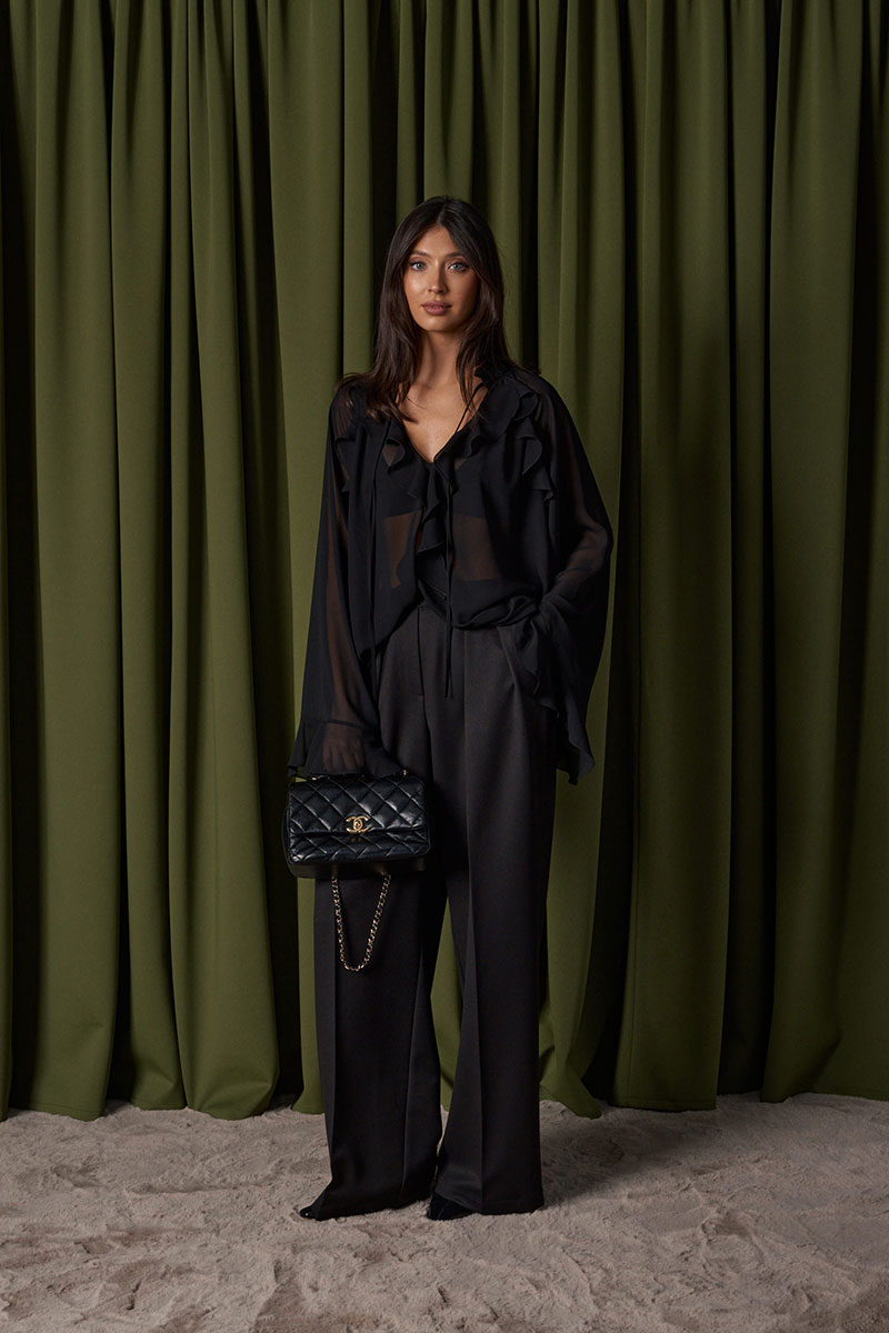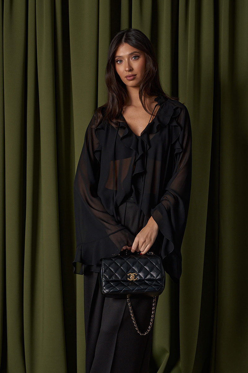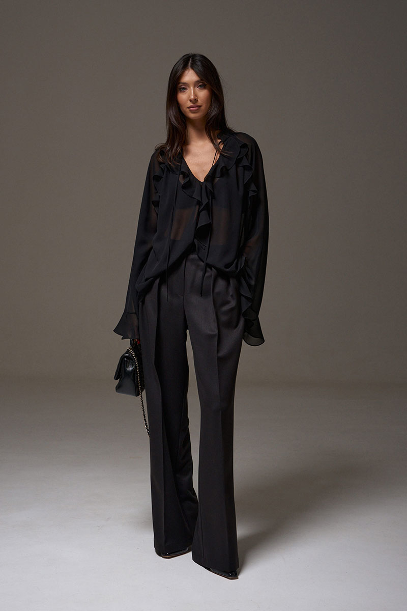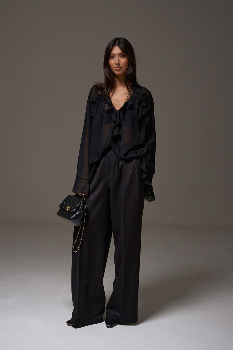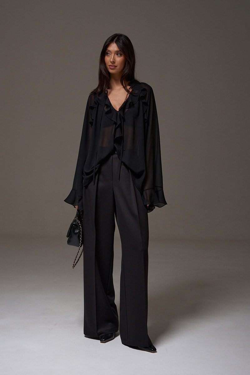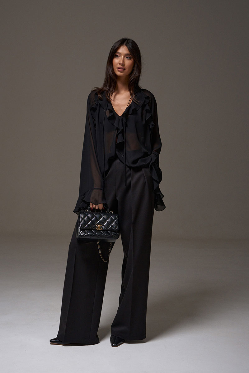 Блузка прямого свободного кроя, выполена из легкой, прозрачной ткани черного цвета. Характеристика: прямой крой, воротник стойка, со сборкой. К горловине пришита рюша с переходом на спинку изделия. Шнурки - завязки функциональные. Рукав свободного прямого кроя, по низу пришита рюша.