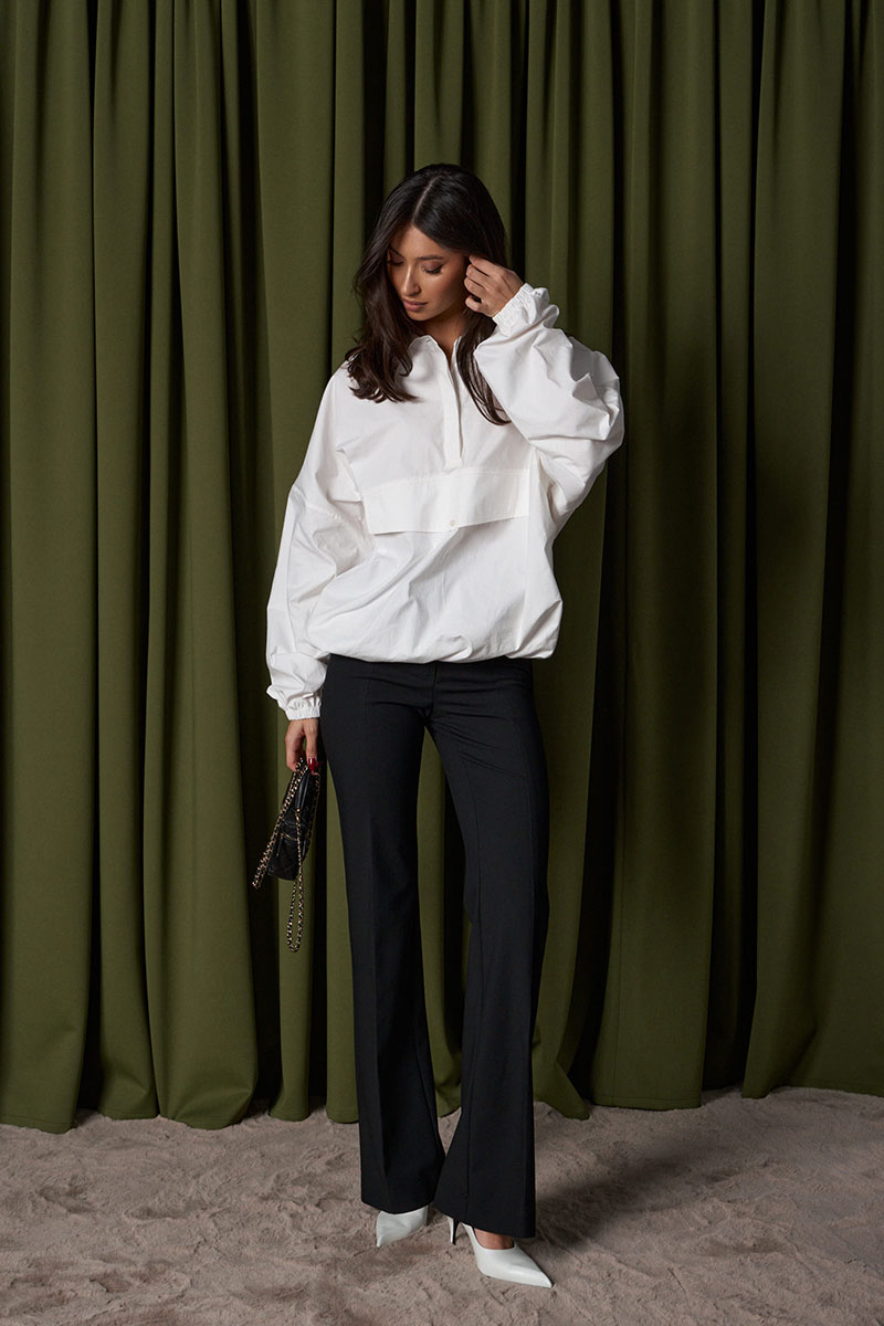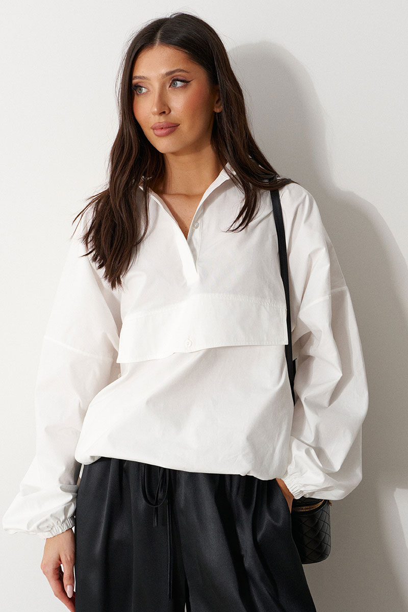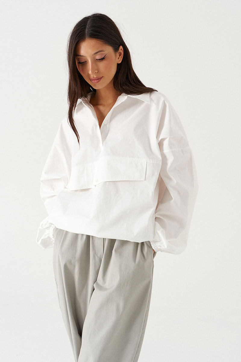 Блузон прямого свободного кроя выполнен из хлопковой ткани. Характеристики: отложной воротник, застежка центральная на петли пуговицы, по переду имитация кармана. Низ изделия на резинке с фиксатором. Плечо спущенно, рукав свободный, низ рукава на резинке.