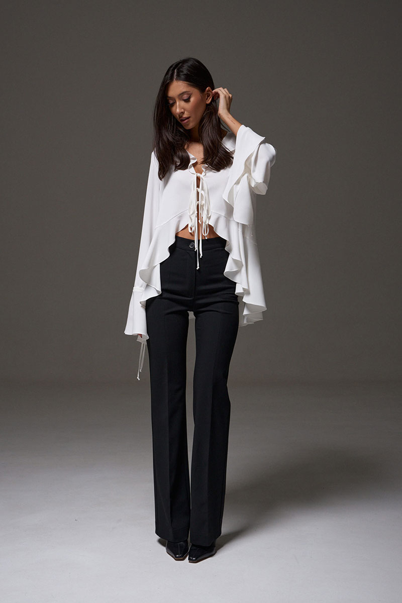 Блуза свободного кроя. Выполнена из мягкого полупрозрачного полотна тёплого белого цвета. Вырез горловины V-образный, с воланом по всей длине (переходит на спинку). Рукав втачной, спущенный, по низу волан с кулиской. Низ блузы по переду фигурный с воланом, волан переходит на спинку. Застёжка центральная - завязки.