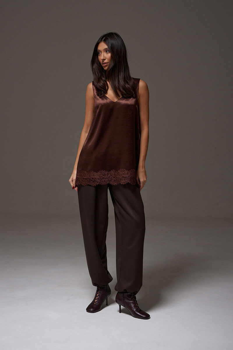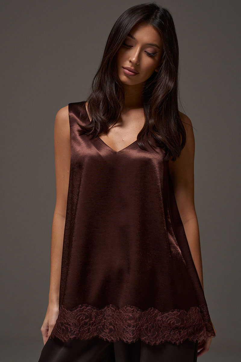 Блузон в крое трапеция, выполнен из струящейся ткани коричневого цвета. Характеристика: крой трапеция - расширяется к низу, широкие бретели, спереди v-образный вырез, по спинке овальная горловина, спинка изделия чуть удлинена, по низу изделия пришито кружево.