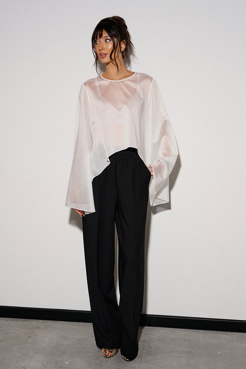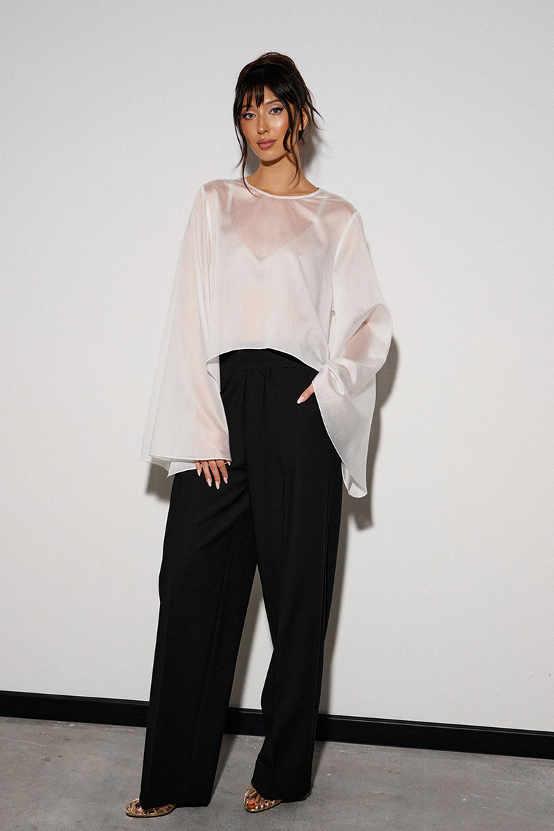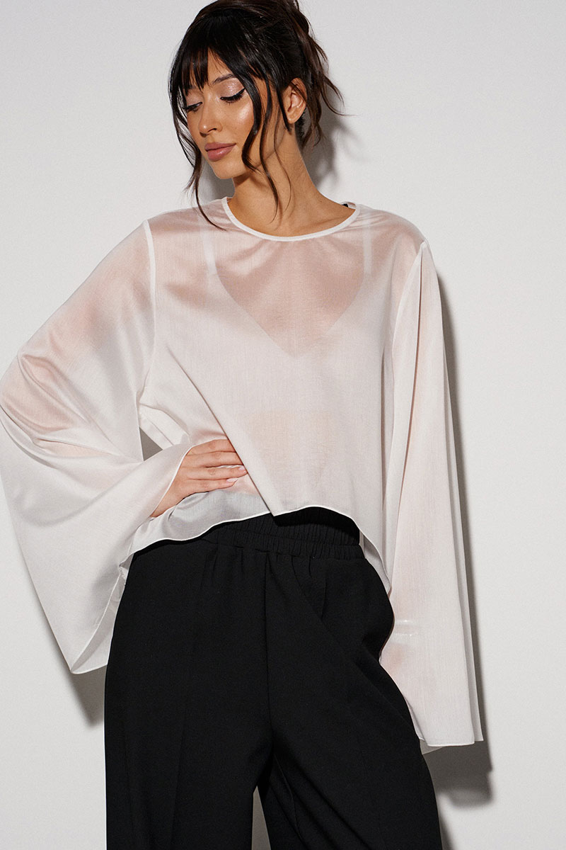 Блузон свободного прямого кроя, выполнен из тонкого белого полотна. Характеристика: свободный крой, овальная горловина. Рукав втачной, свободного кроя, расклешенный к низу. Спинка цельнокроеная, по переду изделия срез.