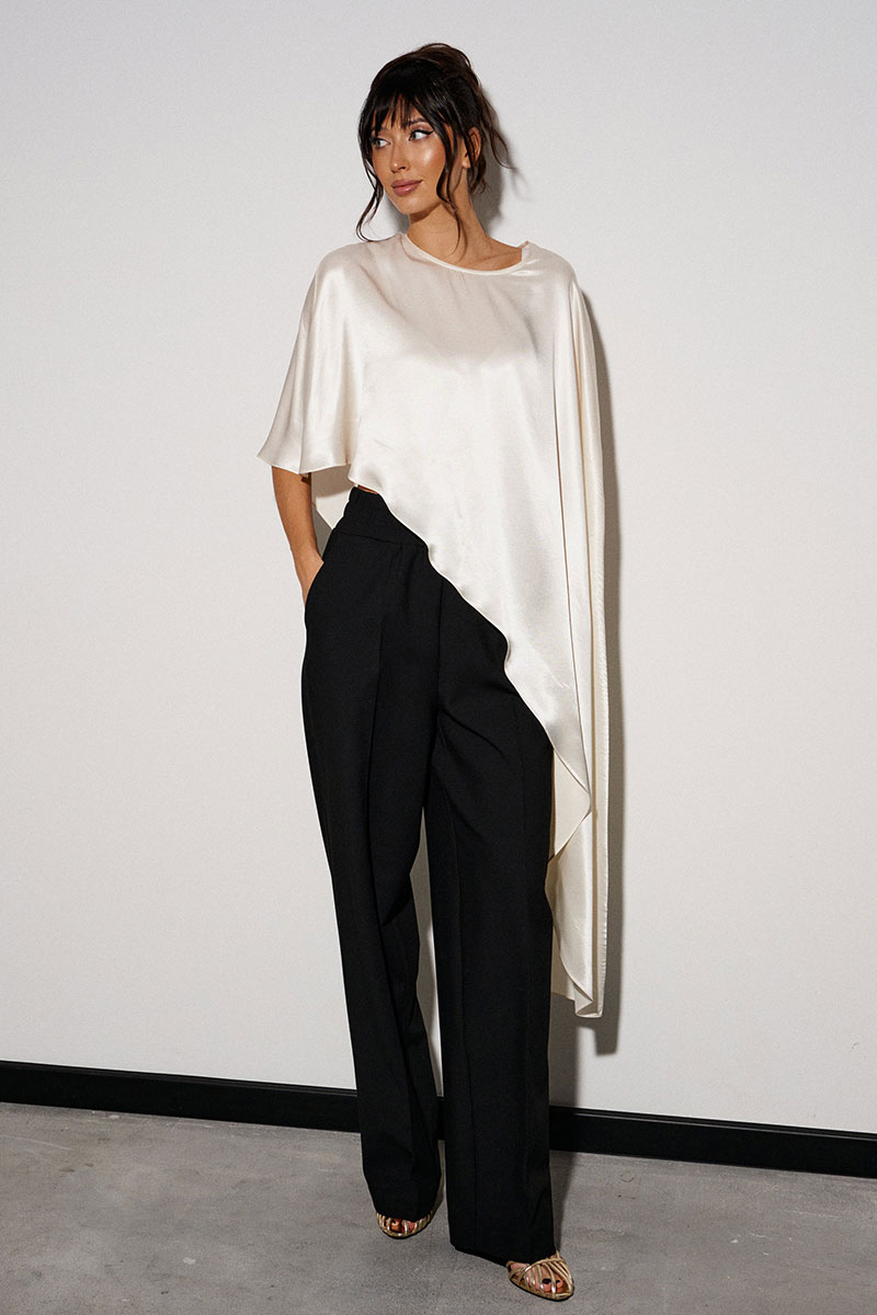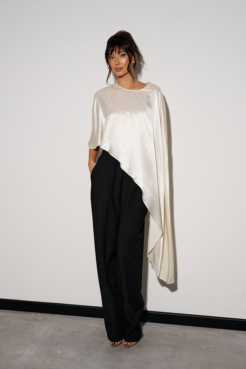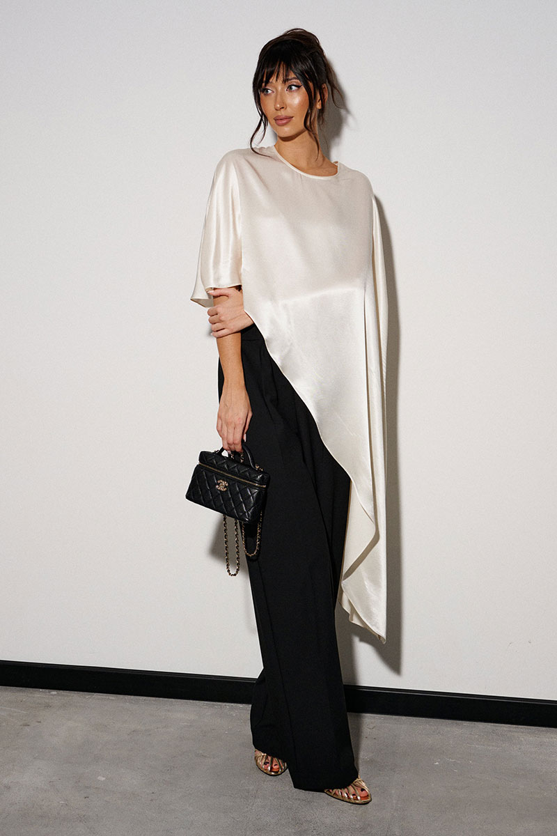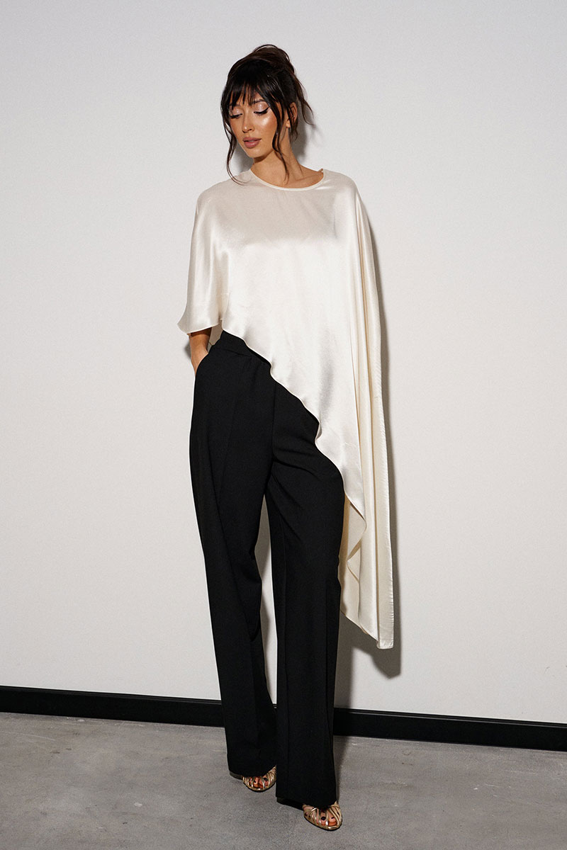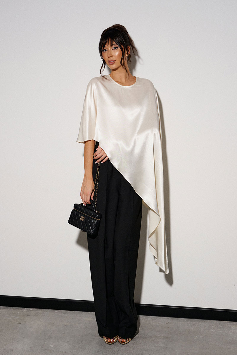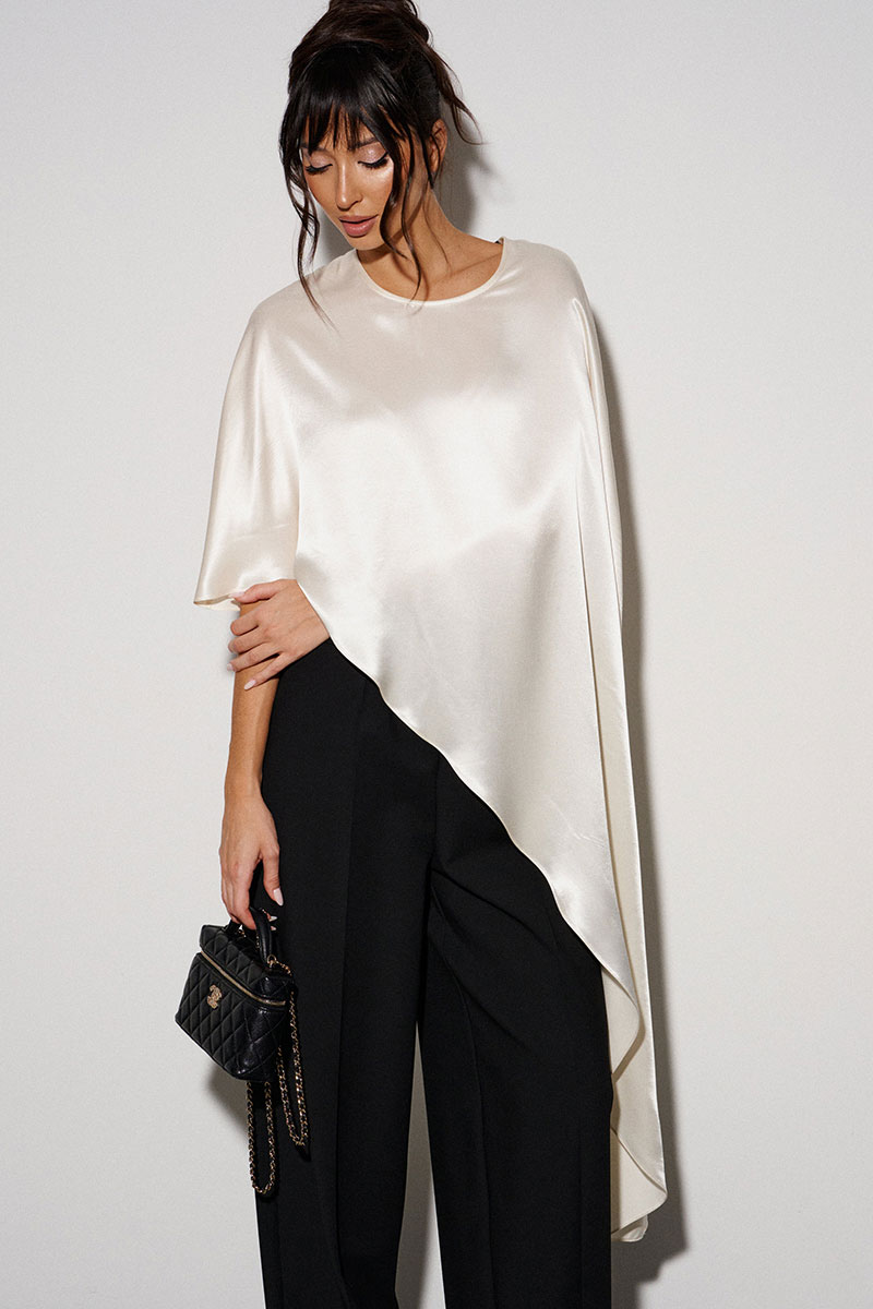 Кейп выполнен легкой, струящейся ткани цвета айвори. Характеристики: свободный, асимметричный крой, на спинке застежка-пуговичка.