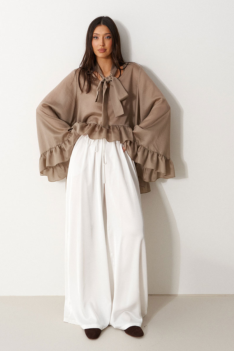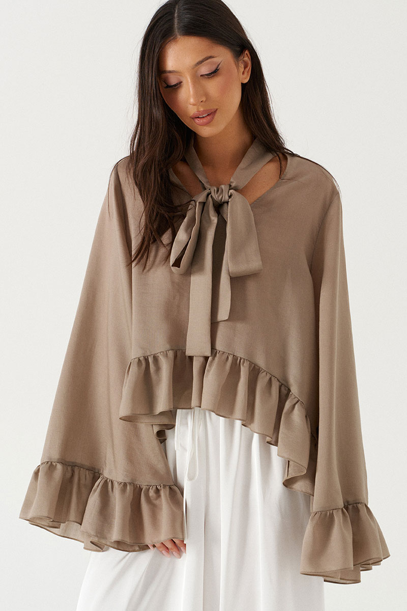Блуза свободного кроя. Выполнена из мягкой полупрозрачной ткани в цвете хаки. Вырез горловины V-образный. Вырез декорирован бантом. Рукав втачной, спущенный. Рукав и низ изделия с воланом.