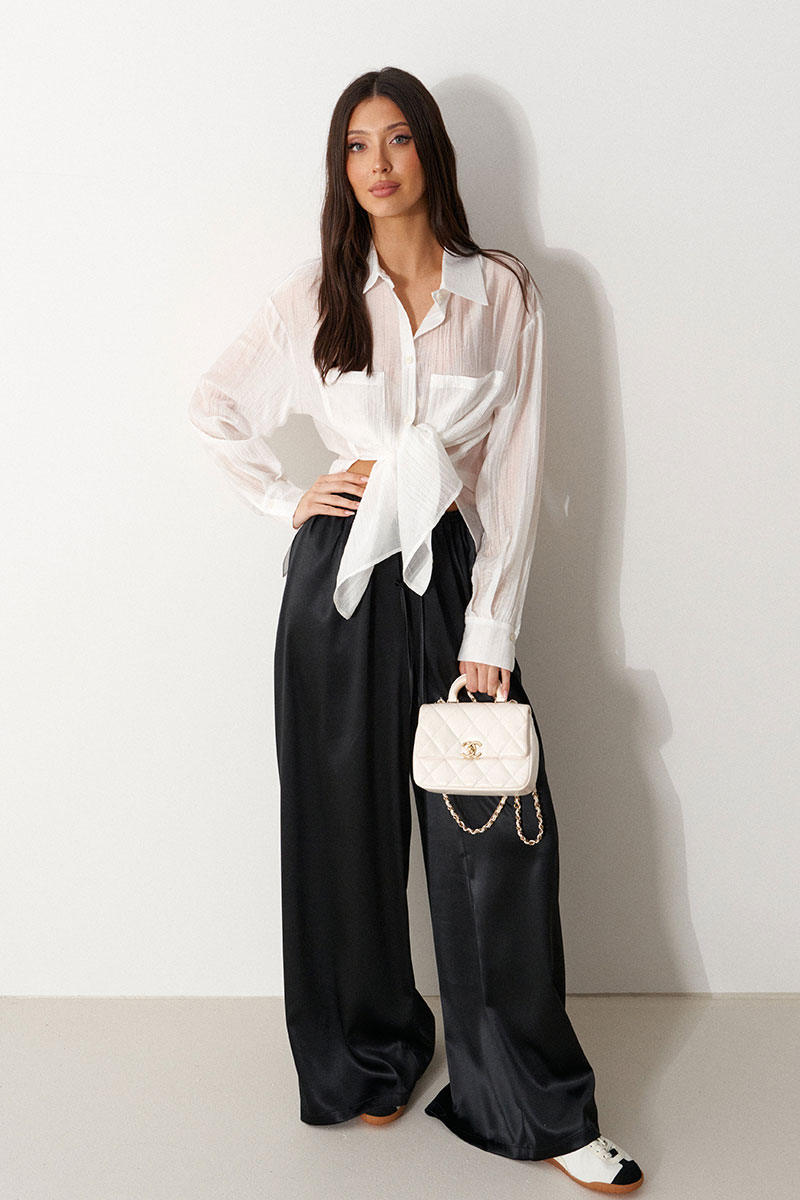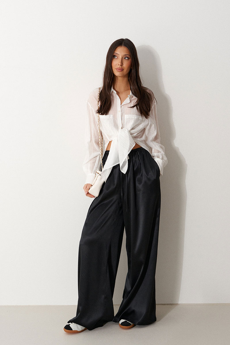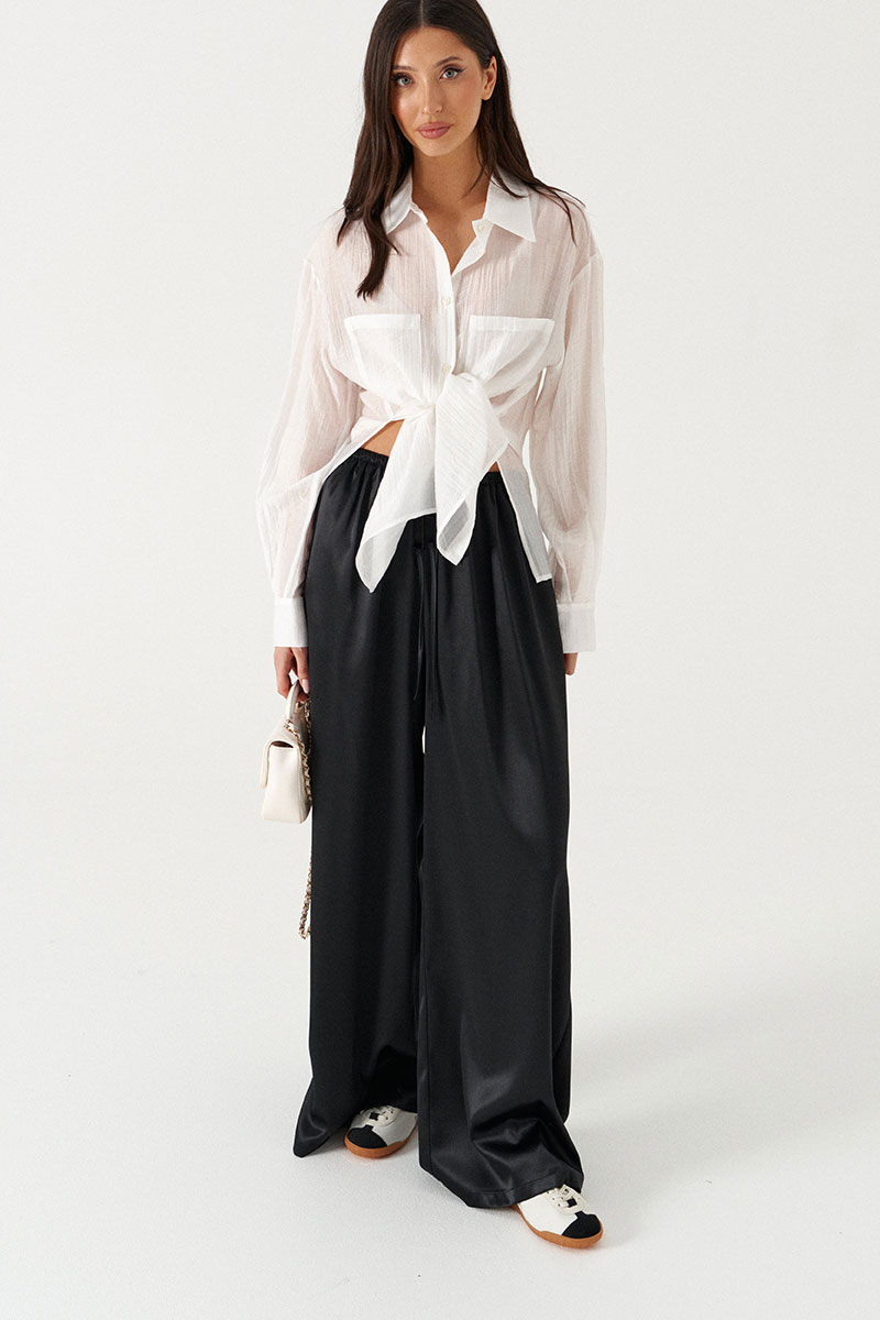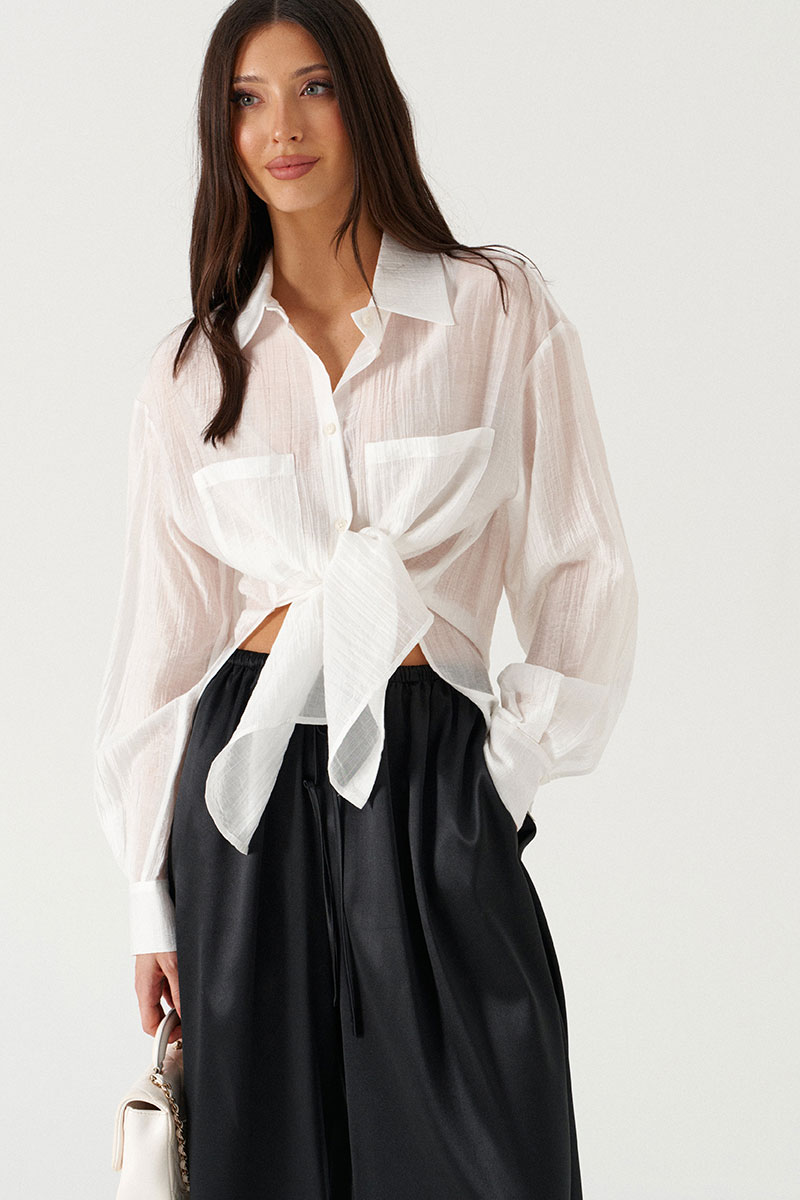 Блузка женская прямого силуэта, свободного облегания. Выполнена из полупрозрачного полотна. Характеристика: Воротник отложной на стойке. Рукав одношовный, втачной, со спущенной линией плеча. На переде по линии груди настрочены прямоугольные накладные карманы. Спинка цельная. В боковых швах обработаны разрезы. Застежка центральная, цельнокроеная планка, застегивающаяся на пробивные петли, пришивные пуговицы. На манжетах декоративная пуговица.