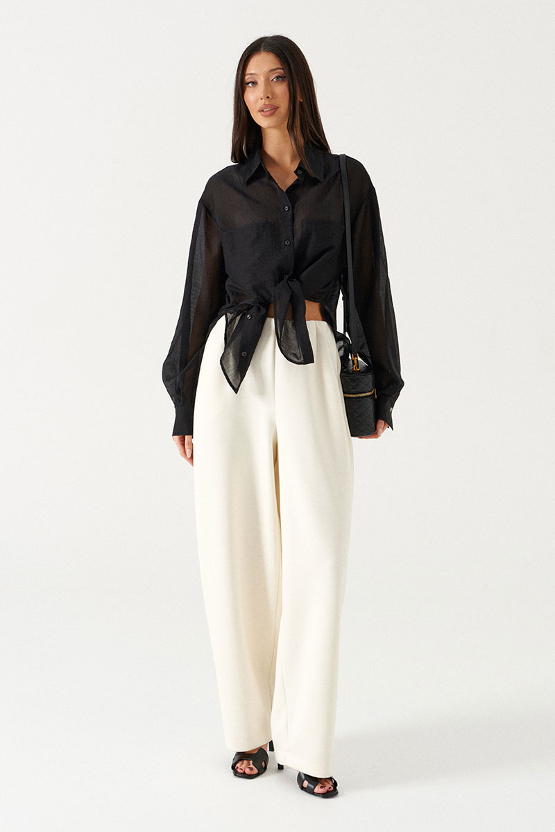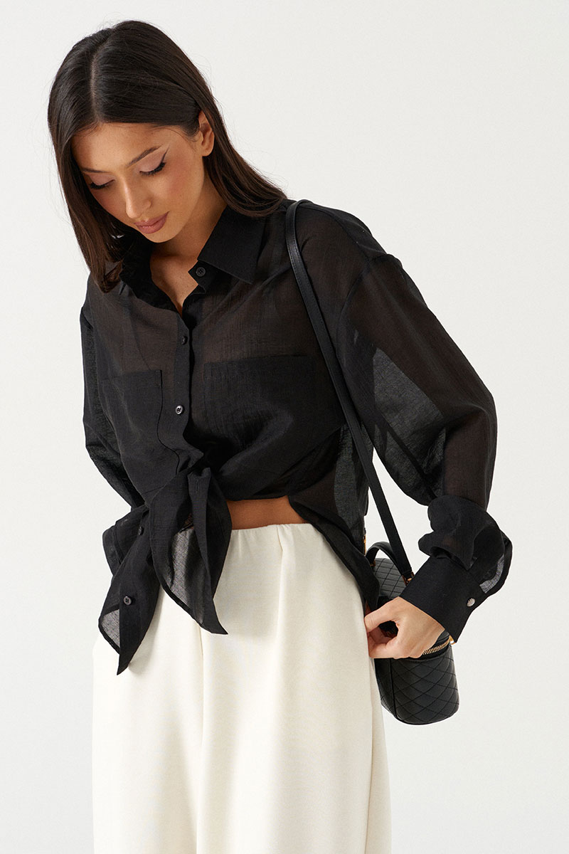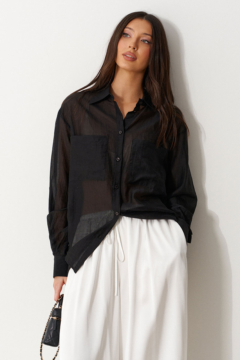 Блузка женская прямого силуэта, свободного облегания. Выполнена из черного полупрозрачного полотна. Характеристика: Воротник отложной на стойке. Рукав одношовный, втачной, со спущенной линией плеча. На переде по линии груди настрочены прямоугольные накладные карманы. Спинка цельная. В боковых швах обработаны разрезы. Застежка центральная, цельнокроеная планка, застегивающаяся на пробивные петли, пришивные пуговицы. На манжетах декоративная пуговица.