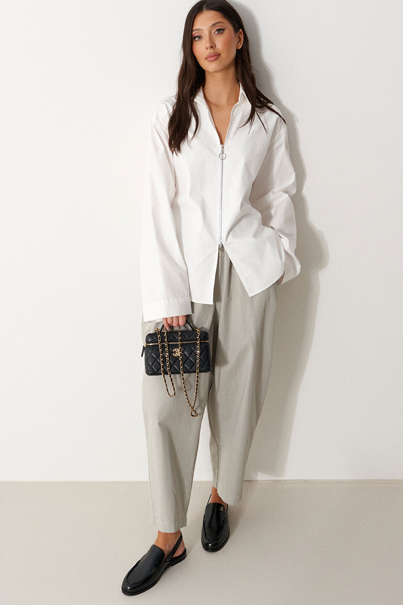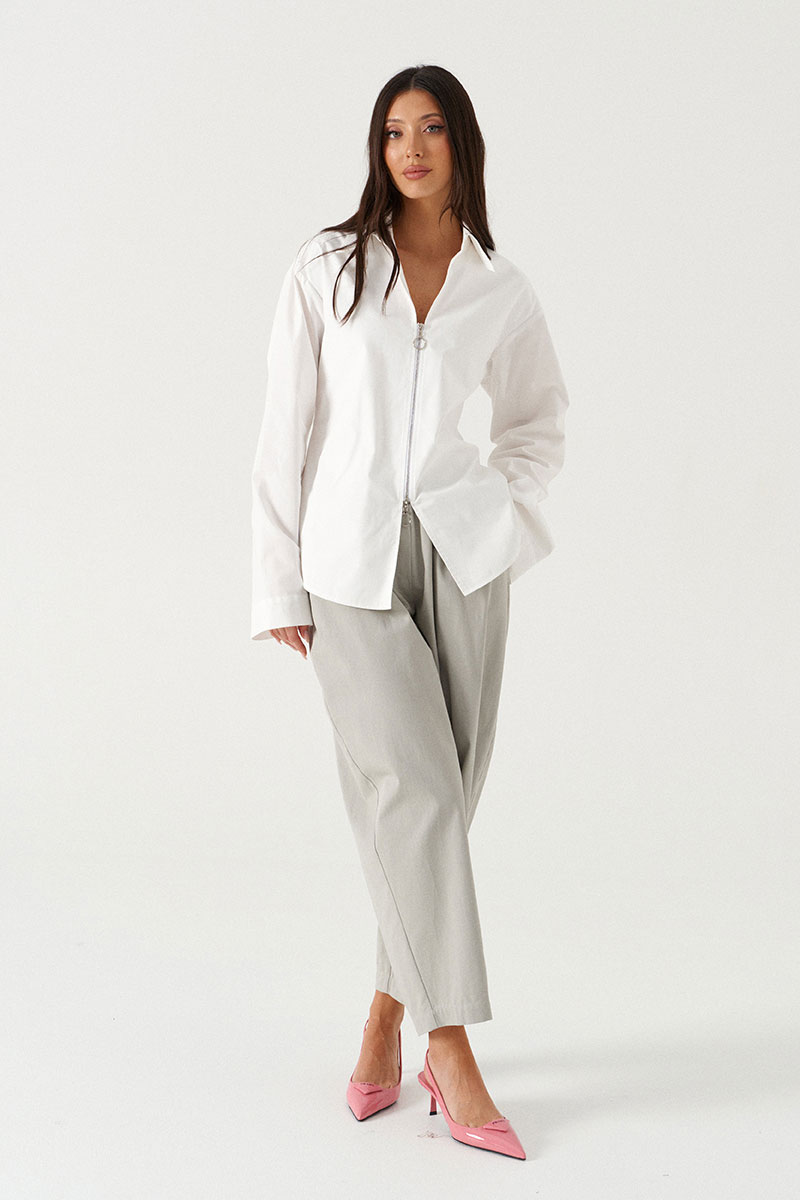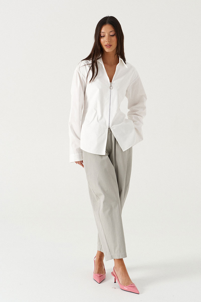 Блузка полуприталенного силуэта выполнена из плотного хлопкового полотна белого цвета. Характеристики: двойная полочка, отлжной воротник, застежка-молния с возможностью открытия с двух сторон, расклешенный рукав, отрезная спинка.