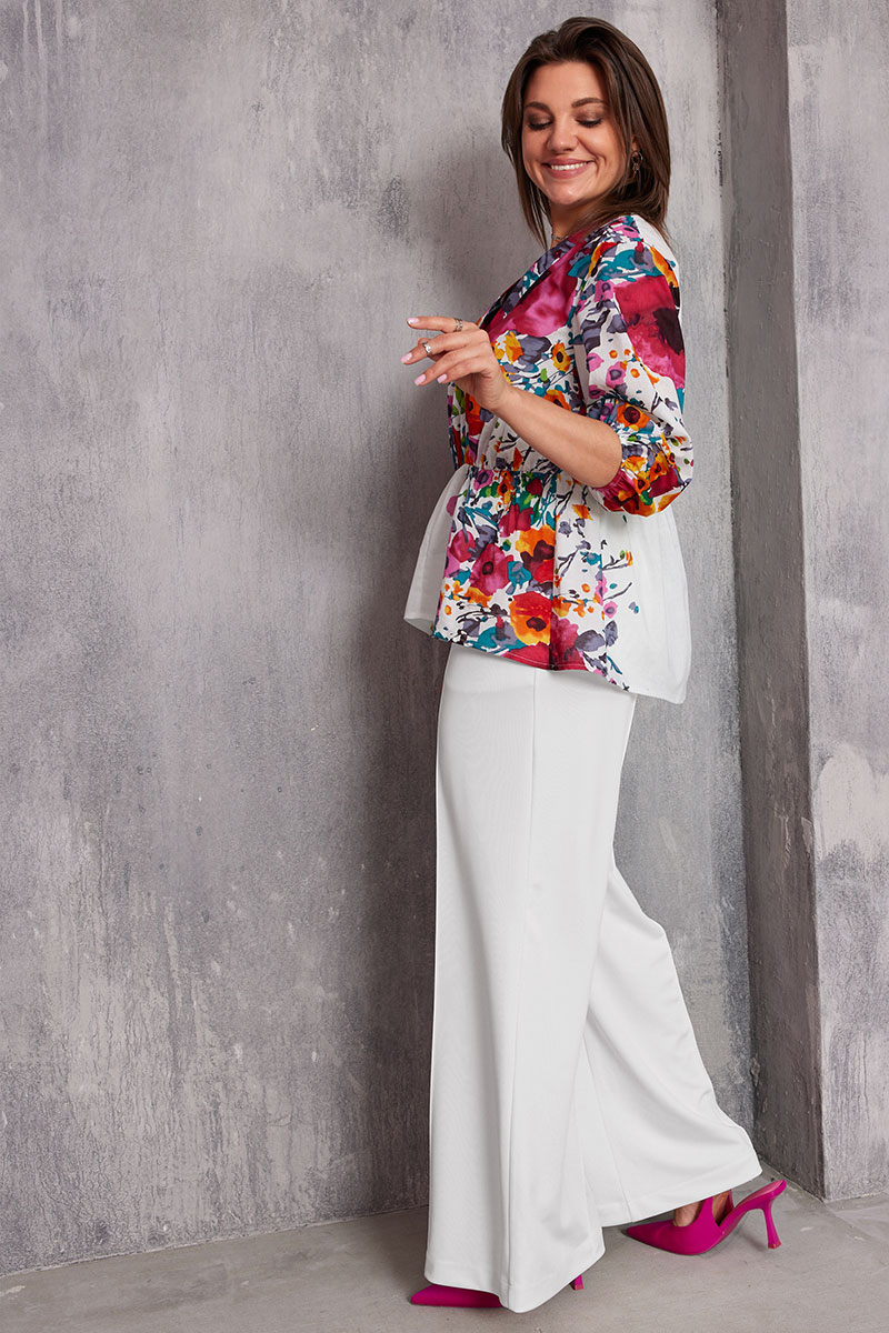 Передняя часть блузы на притачной планке, имеющей застёжку на петли-пуговицы. V-образный вырез формирует красивое декольте. По нижней части притачная баска, которая отлично скрывает животик и визуально дарит чувство лёгкости. Втачные рукава придают образу игривость и свободу, низ которых собран на резинке.