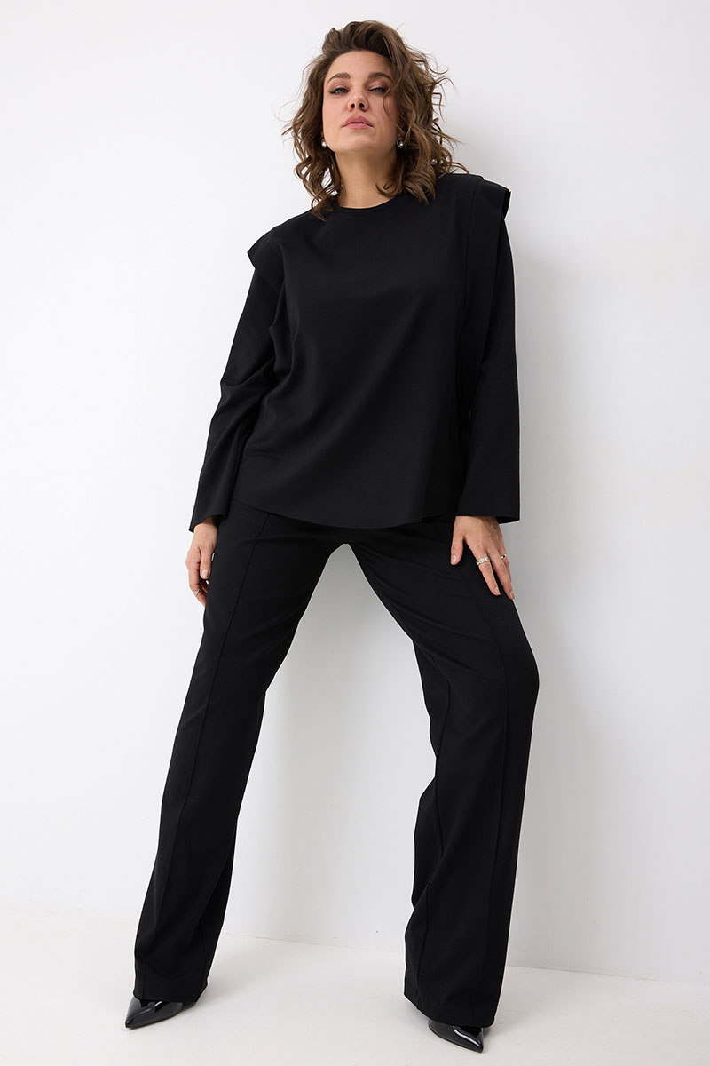 Лонгслив свободного кроя. Горловина обработана обтачкой с открытым срезом. Низ рукава и низ изделия имеют открытые срезы. На плечах металлические декоративные зажимы золотистого цвета.