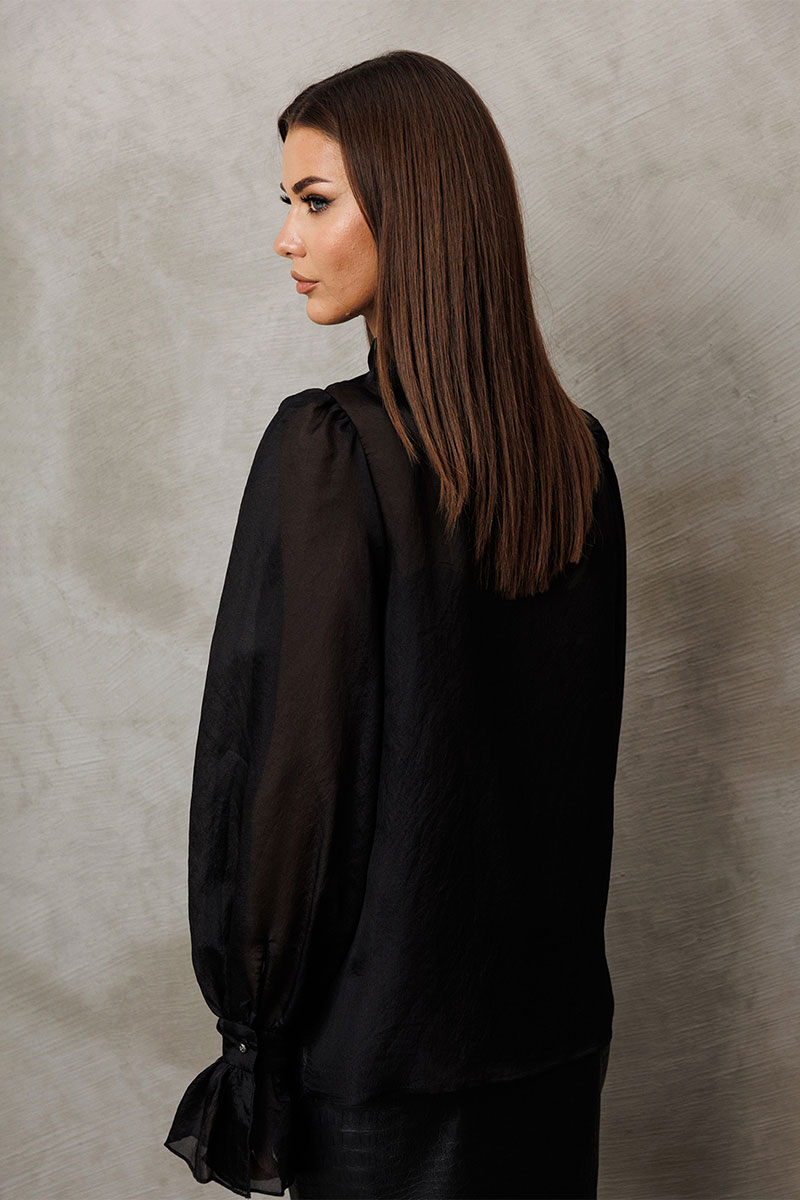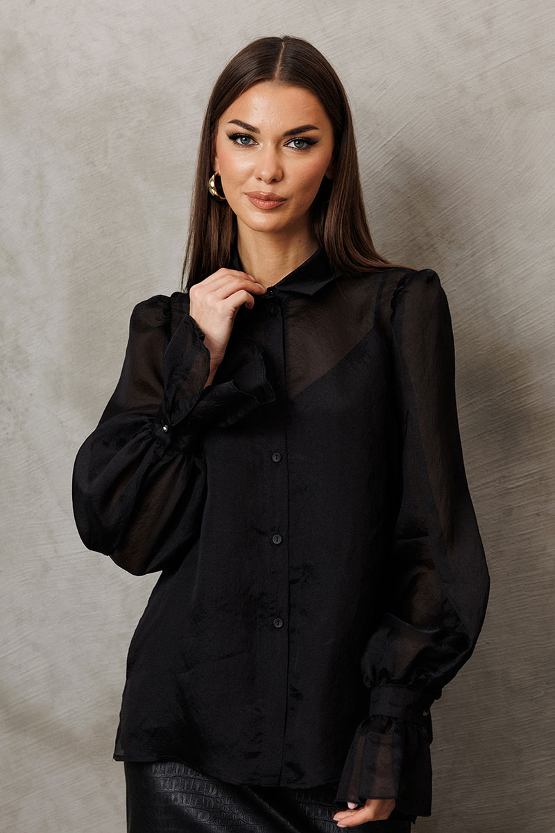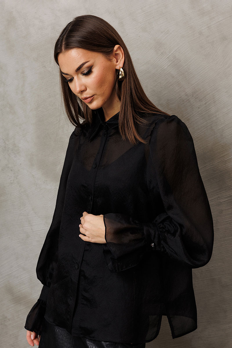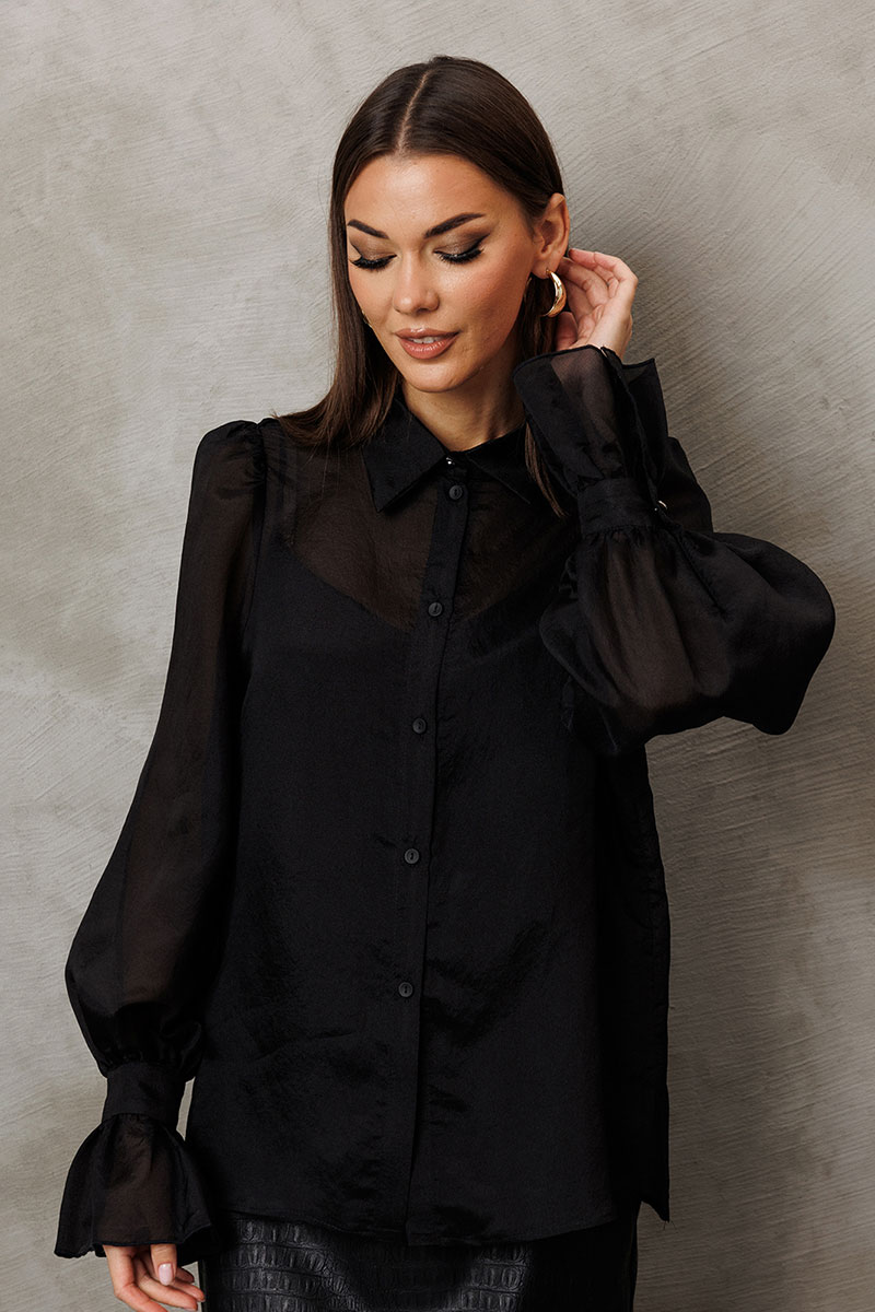 Блузка из креп-шифона с напылением. Прямого силуэта, с втачным рукавом вверху со сборкой внизу на манжете с застежкой на петлю-пуговицу и рюшей на манжете. Полочка с центральной застежкой на петли-пуговицы на цельнокроеной планке. Воротник рубашечный отложной на стойке. Внизу по боковым швам обработаны разрезы. К блузке идет в комплект атласный топ на регулируемых бретелях прямого силуэта, на широкой обтачке. Полочка с V-образным вырезом и нагрудной вытачкой.