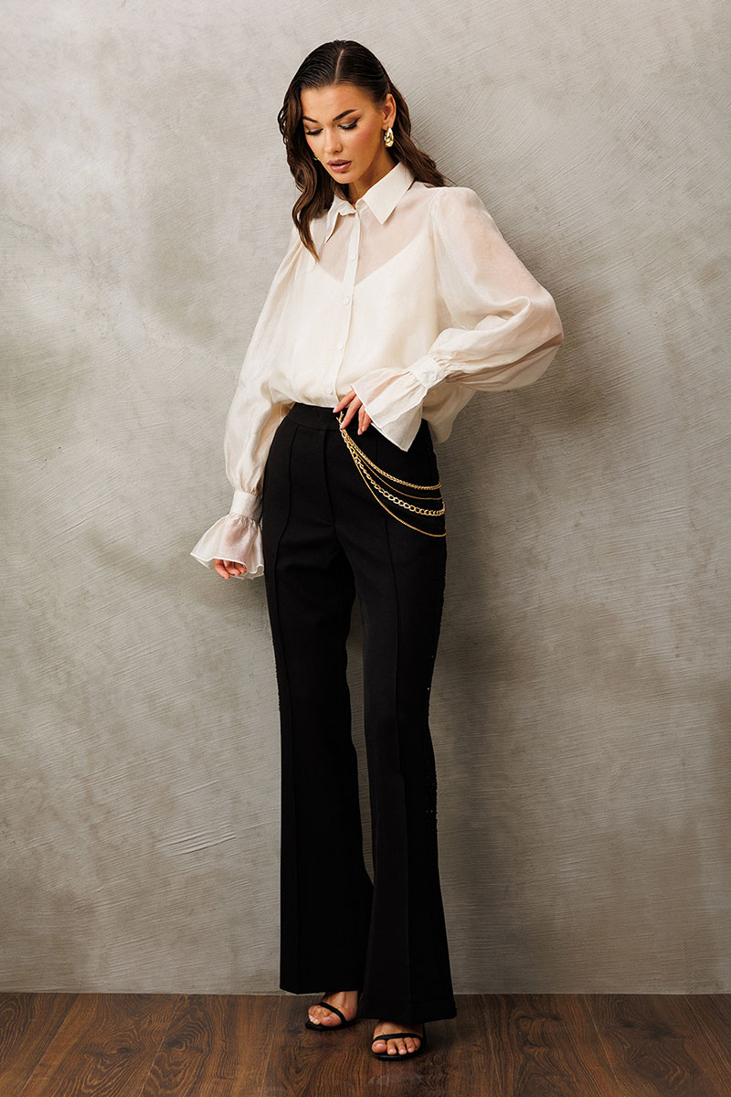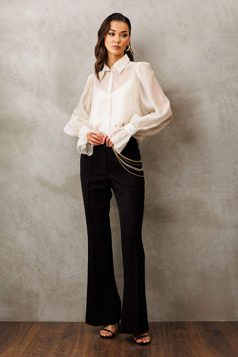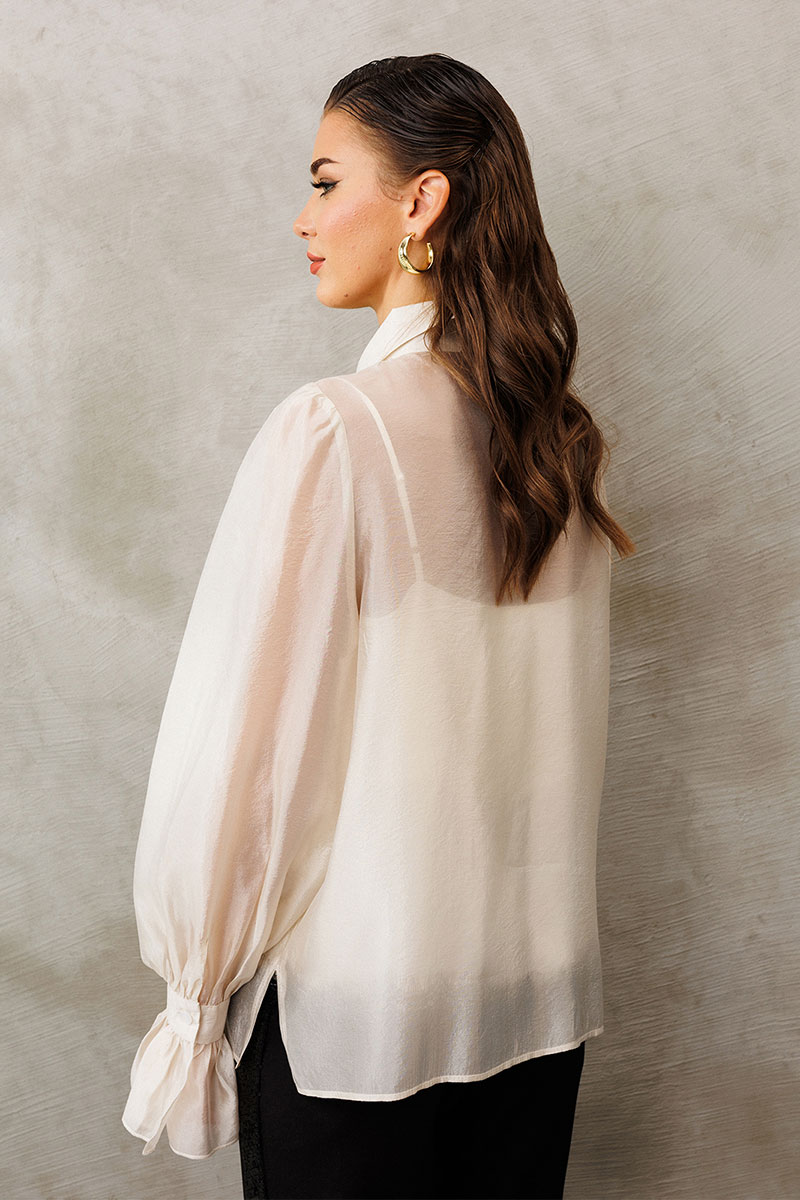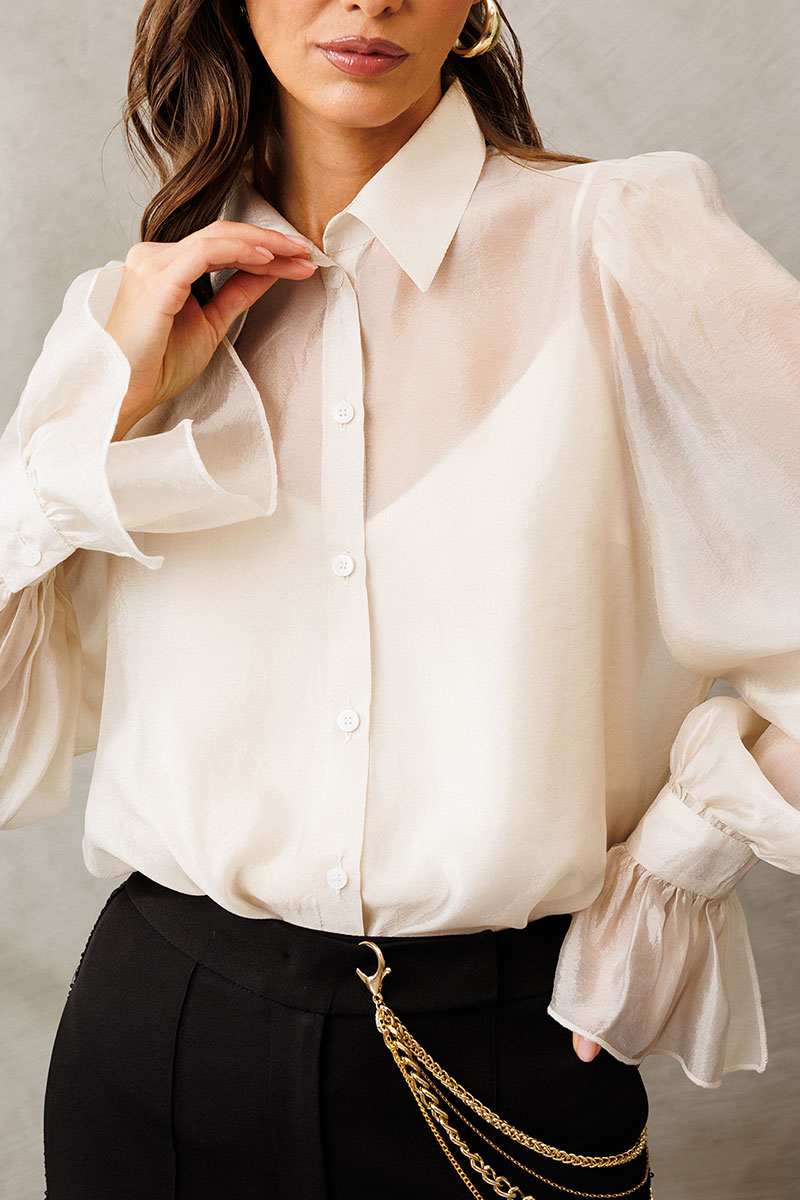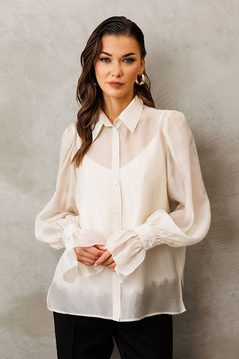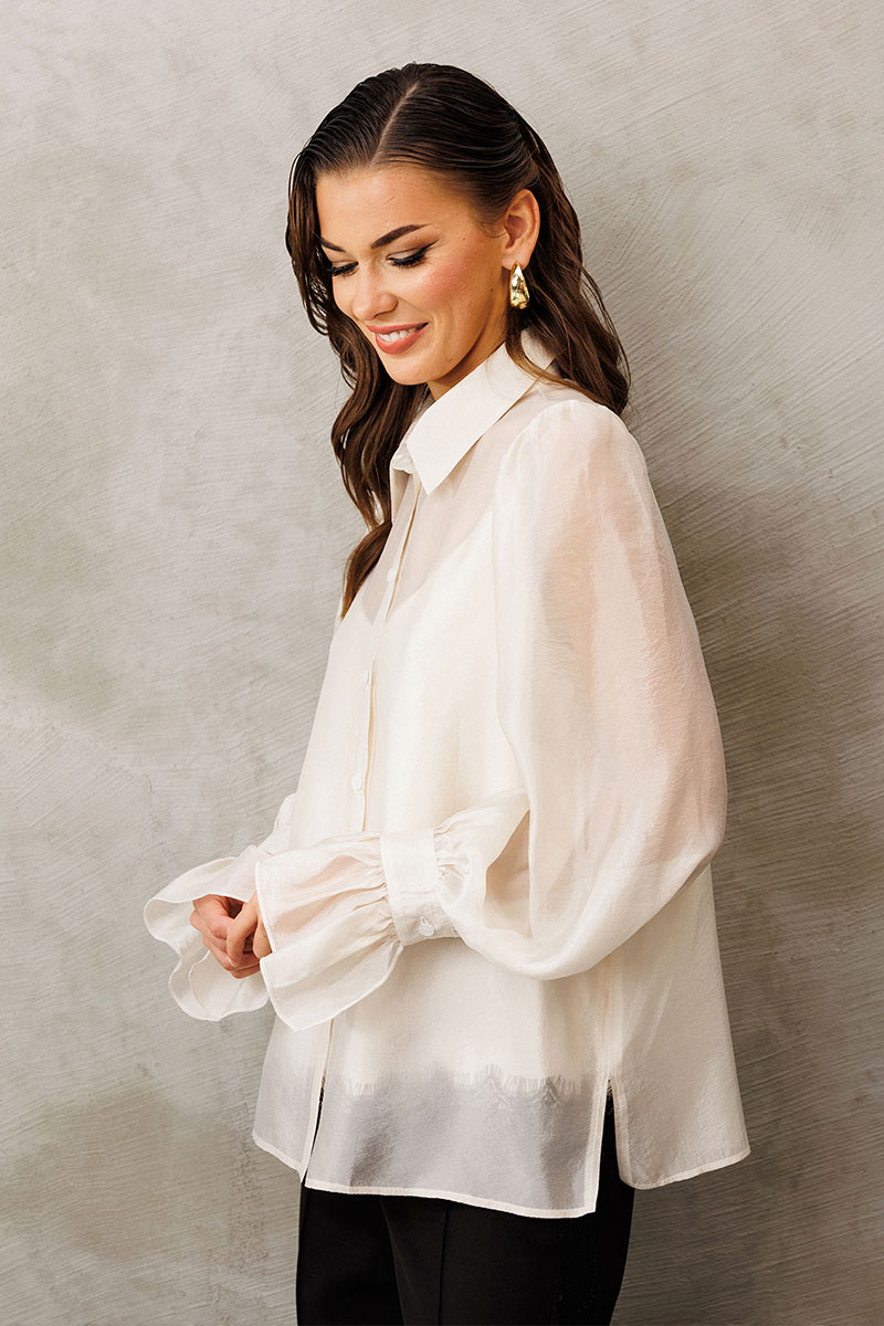 Блузка из креп-шифона с напылением. Прямого силуэта, с втачным рукавом вверху со сборкой внизу на манжете с застежкой на петлю-пуговицу и рюшей на манжете. Полочка с центральной застежкой на петли-пуговицы на цельнокроеной планке. Воротник рубашечный отложной на стойке. Внизу по боковым швам обработаны разрезы. К блузке идет в комплект атласный топ на регулируемых бретелях прямого силуэта, на широкой обтачке. Полочка с V-образным вырезом и нагрудной вытачкой.