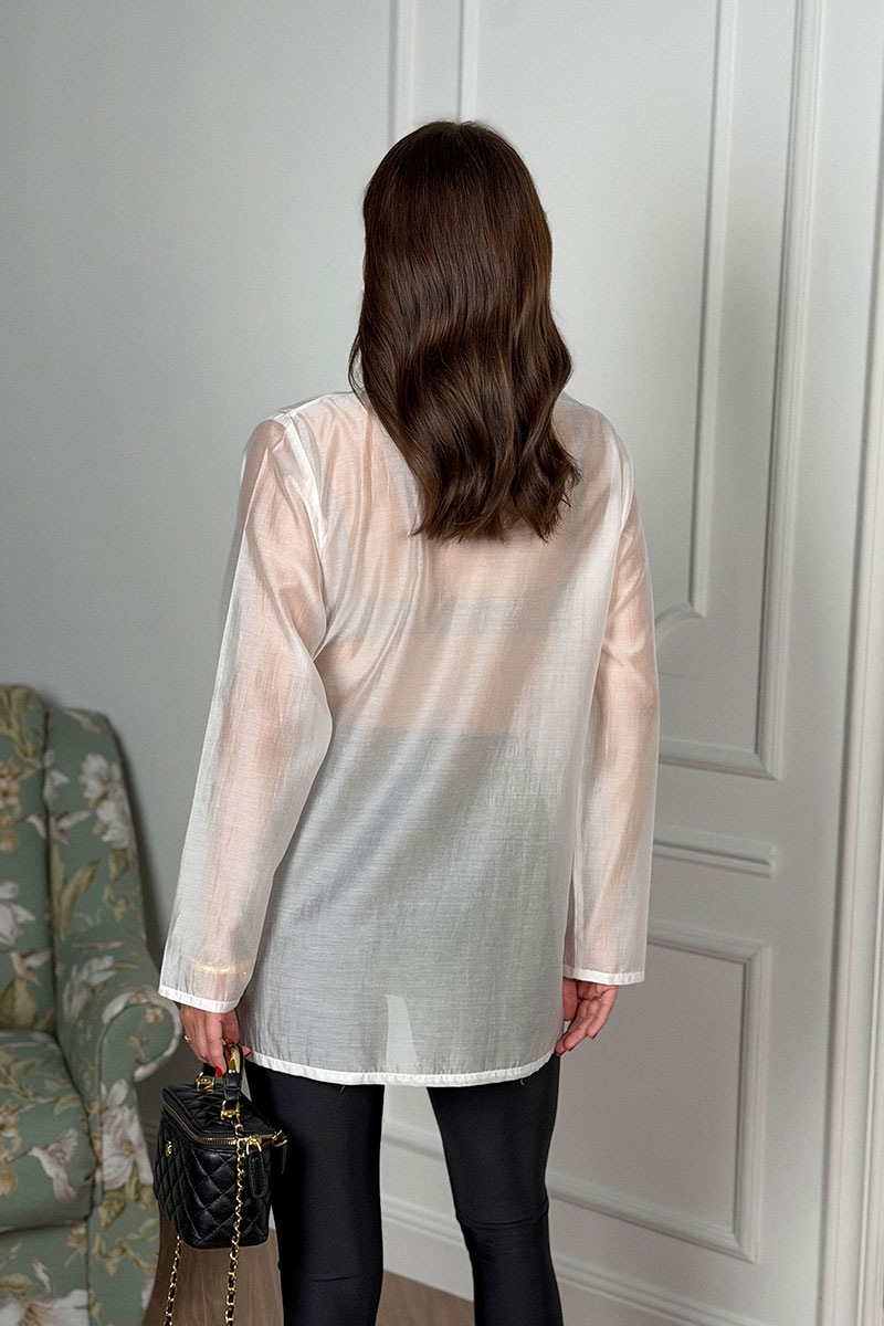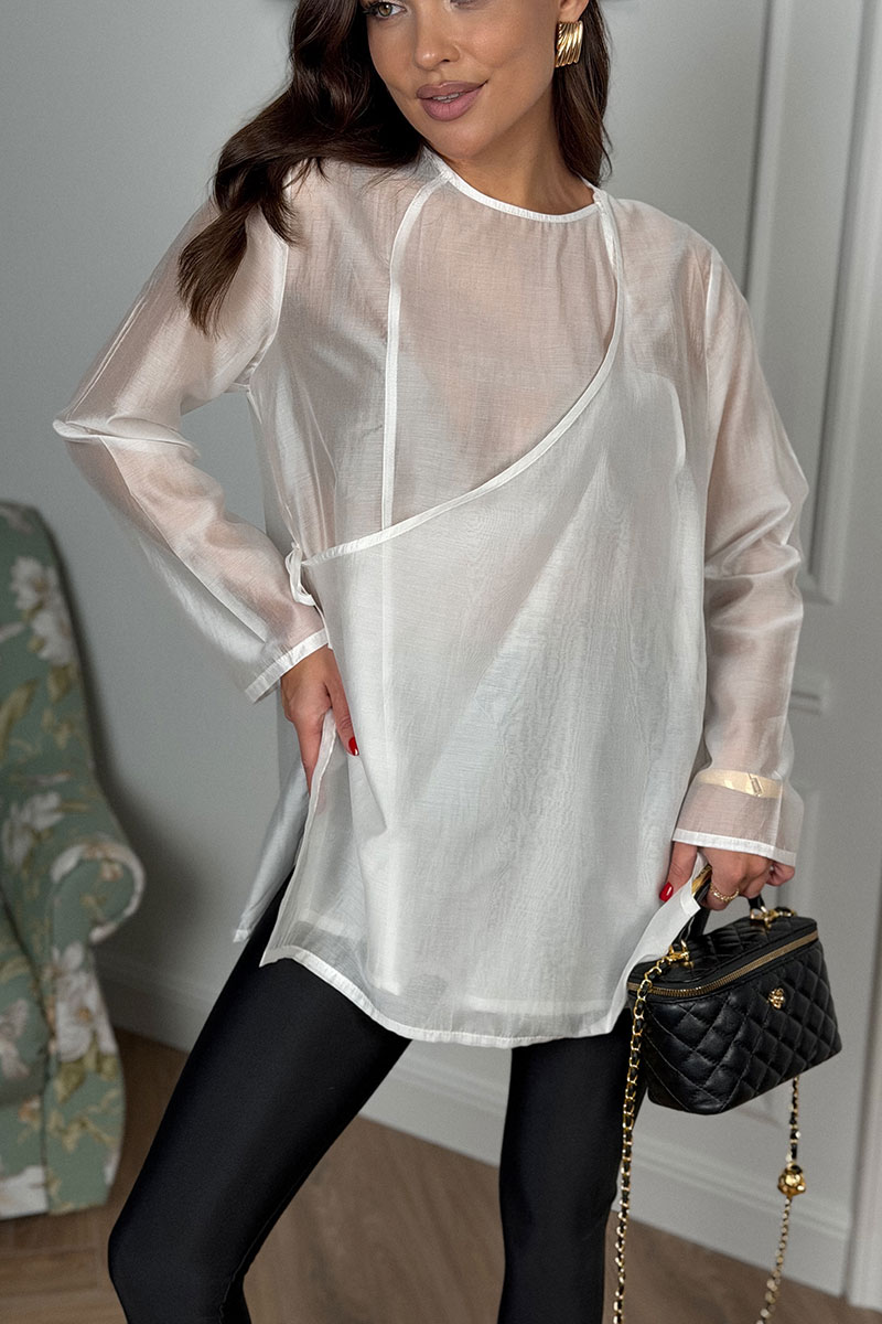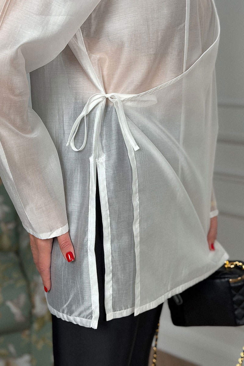 Блузка женская, свободного силуэта. Выполнена из блузочной вискозной вуали высокого качества. Рукав втачной одношовный, горловина круглая, с каплевидным вырезом. Блузка застегивается на запах, фиксируется в области талии на завязки из основной ткани.