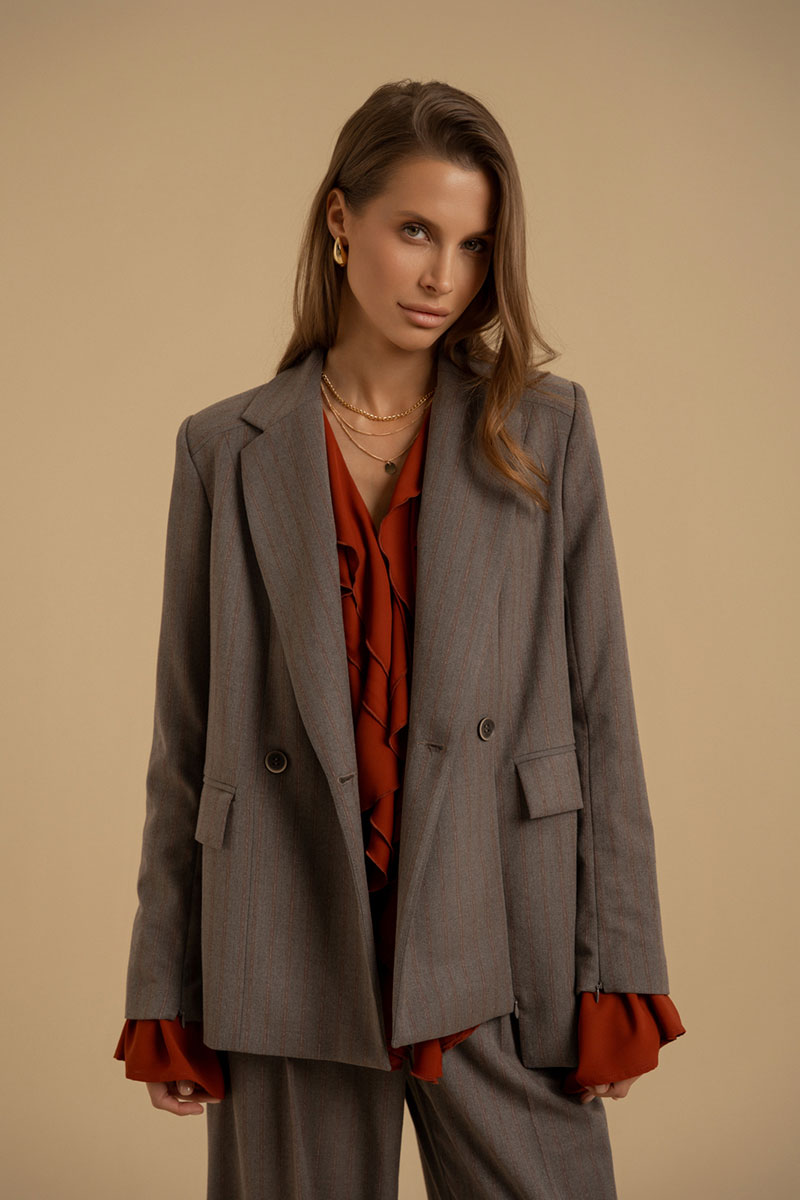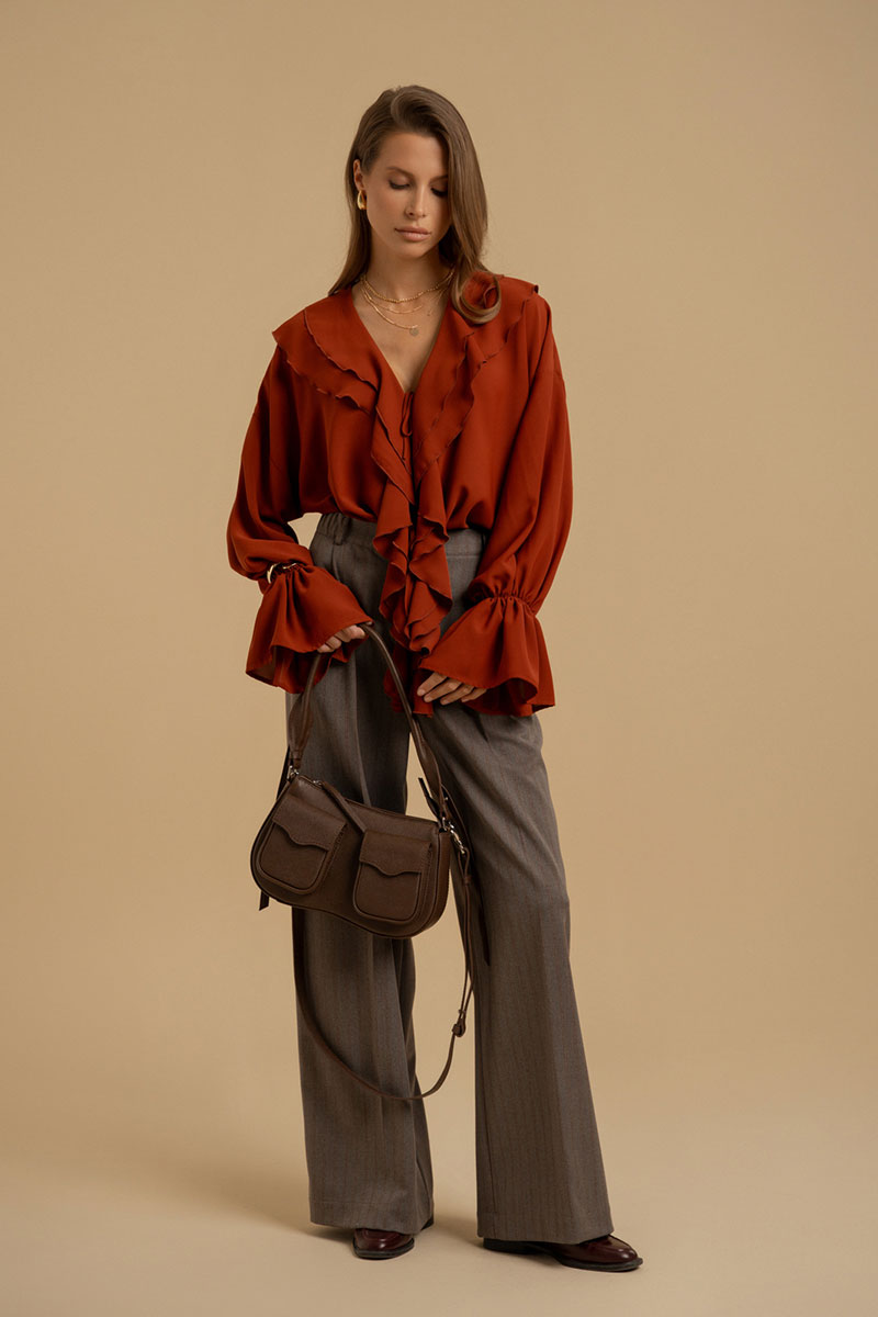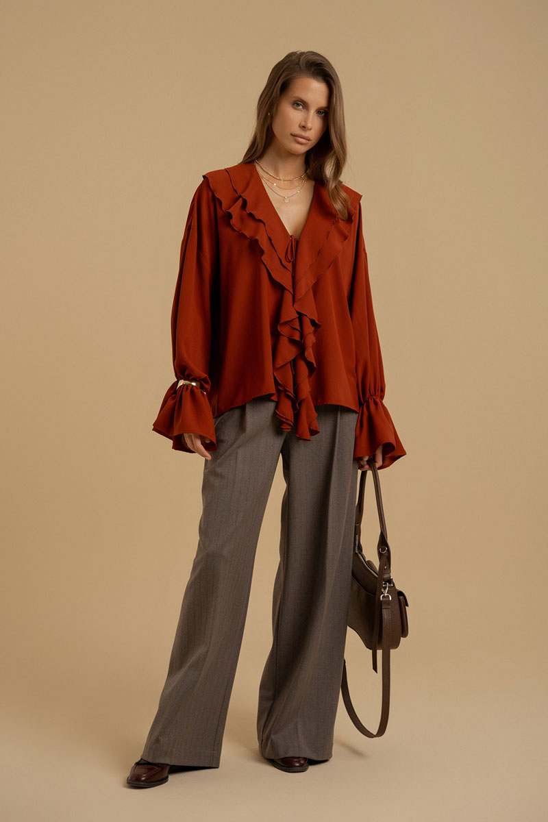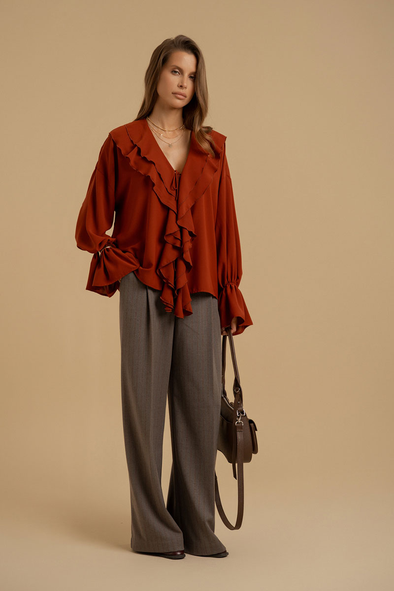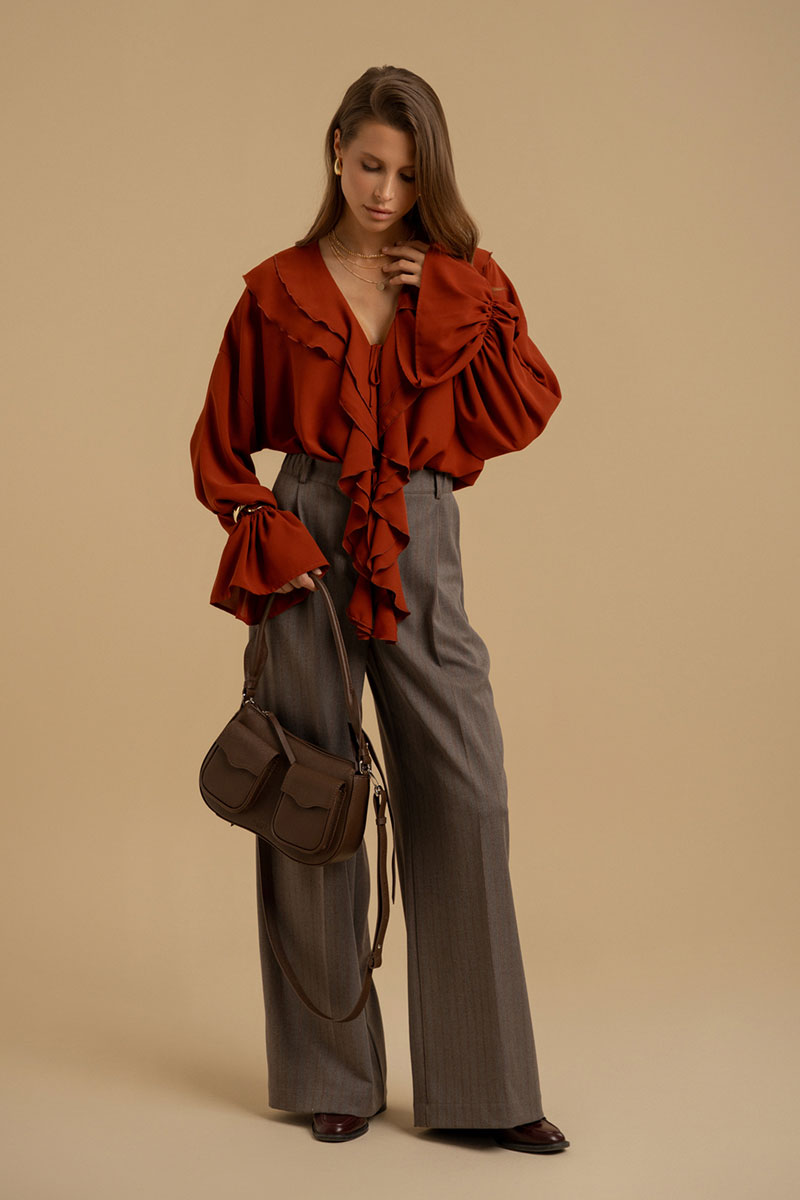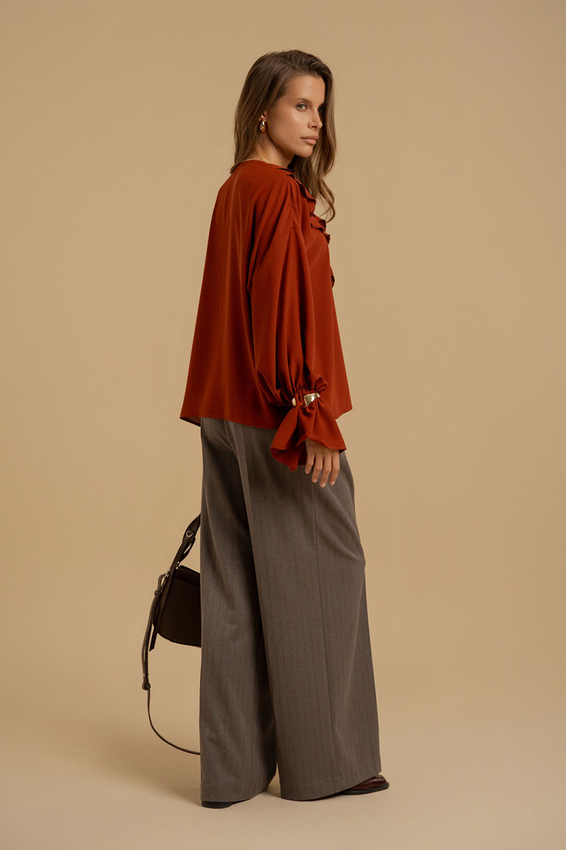 Блузка женская свободного силуэта из легкой плательной ткани. Вырез горловины V-образной формы с воланами. Застежка - завязки. Рукав а- втачные, объемной формы, присборенные внизу на эластичную тесьму.