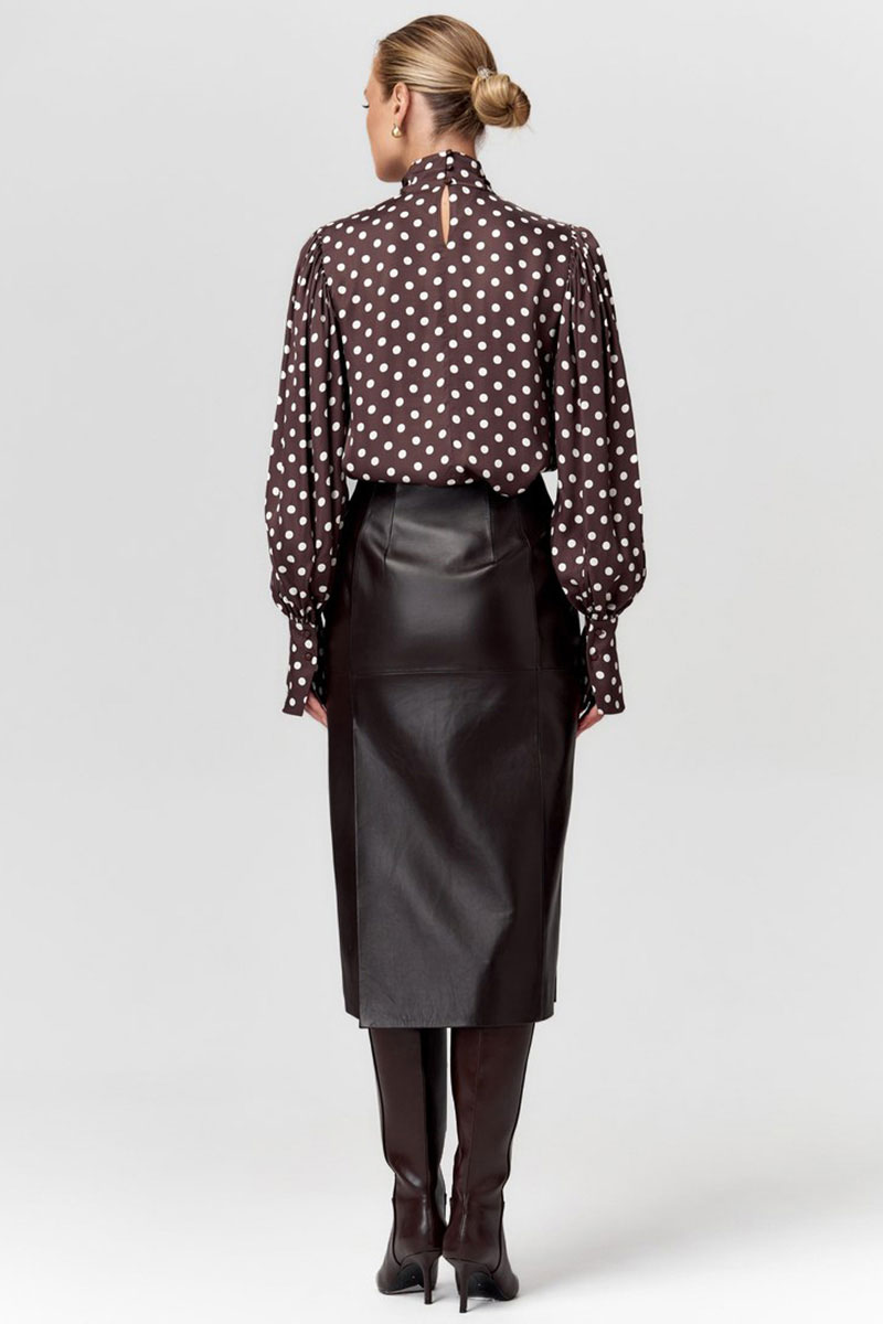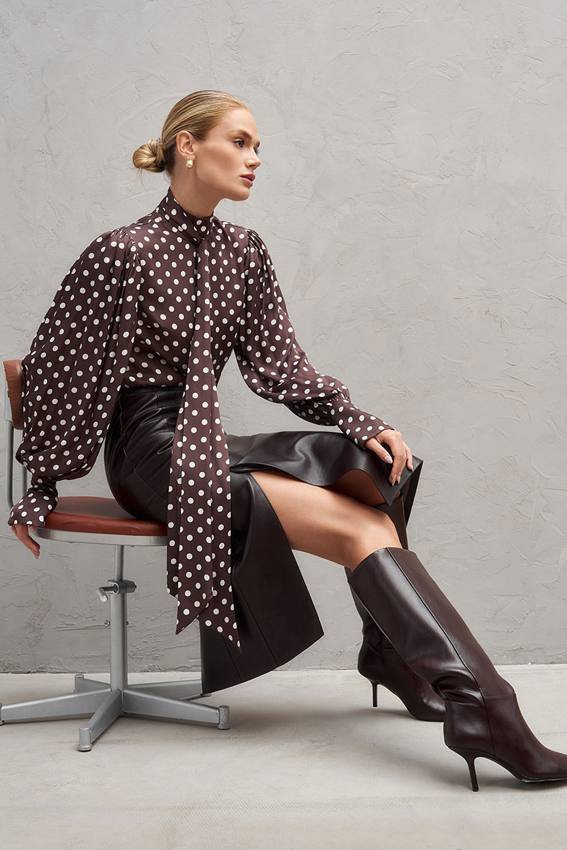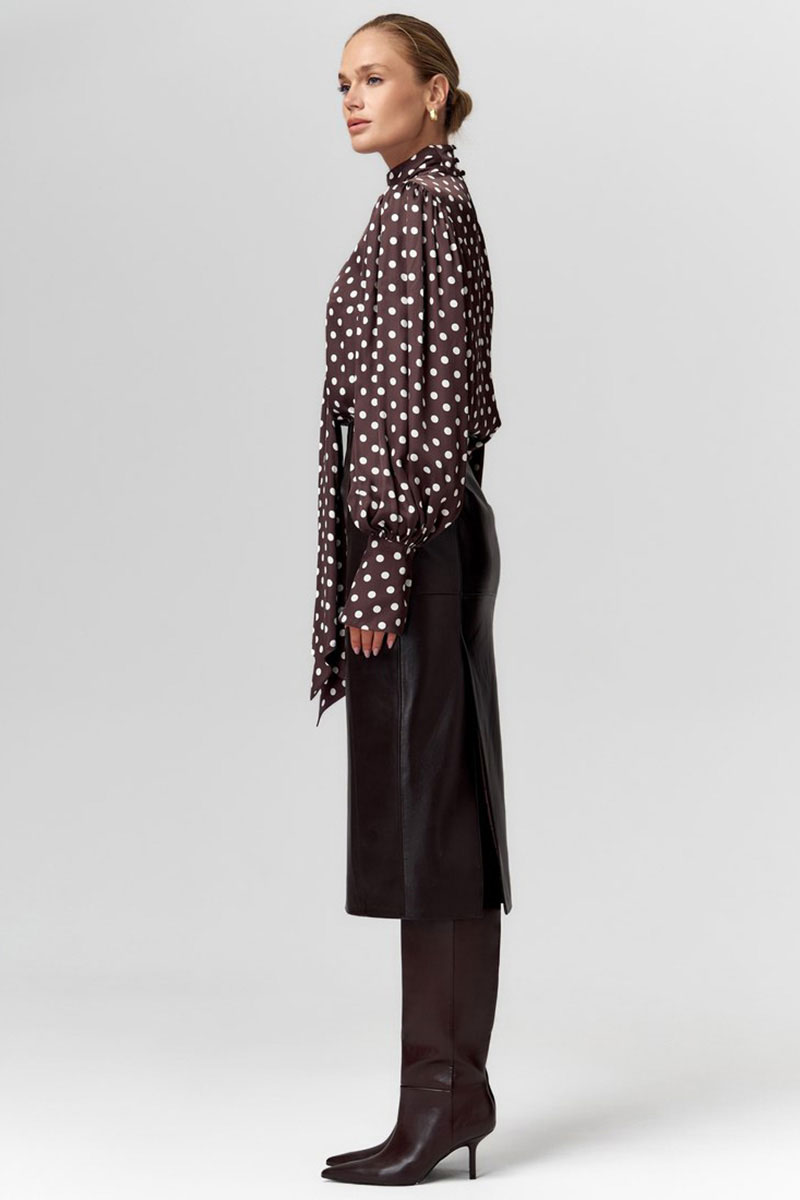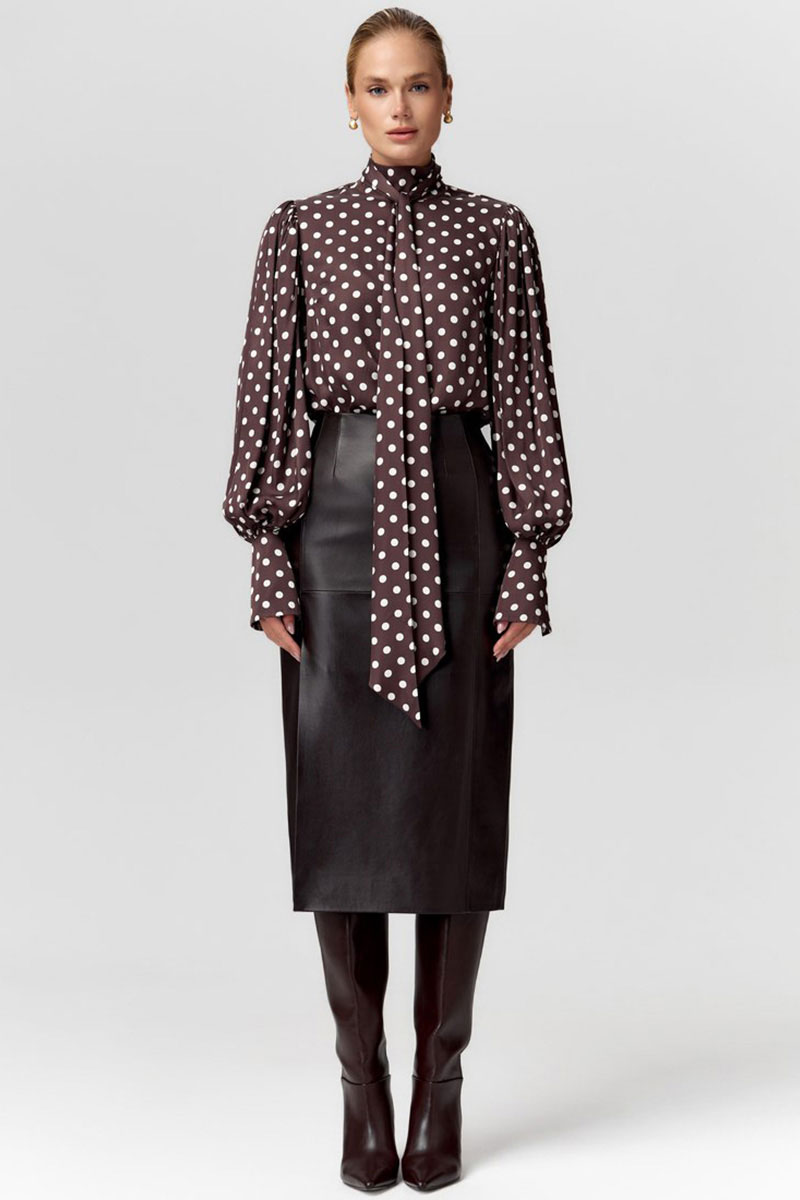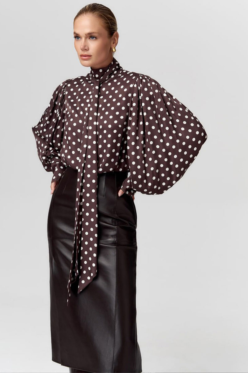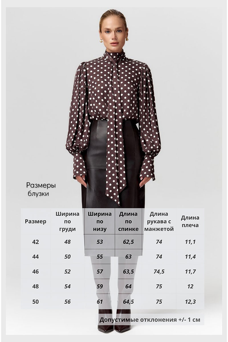 Эффектная блузка в романтическом стиле из плотной атласной вискозы в горох. Прямой силуэт с пышными рукавами со сборкой и высокими манжетами. Воротник-стойка с застёжкой на пуговицы и длинным шарфом-лентами, который можно стилизовать по разному, создавая образы и настроение. Измерения готового изделия расположены в табличке с фотографиями. Параметры модели на фото (см): 90/65/95, размер: 44/S, рост: 175 см.