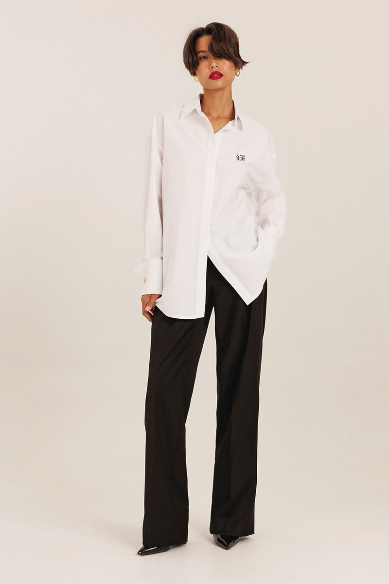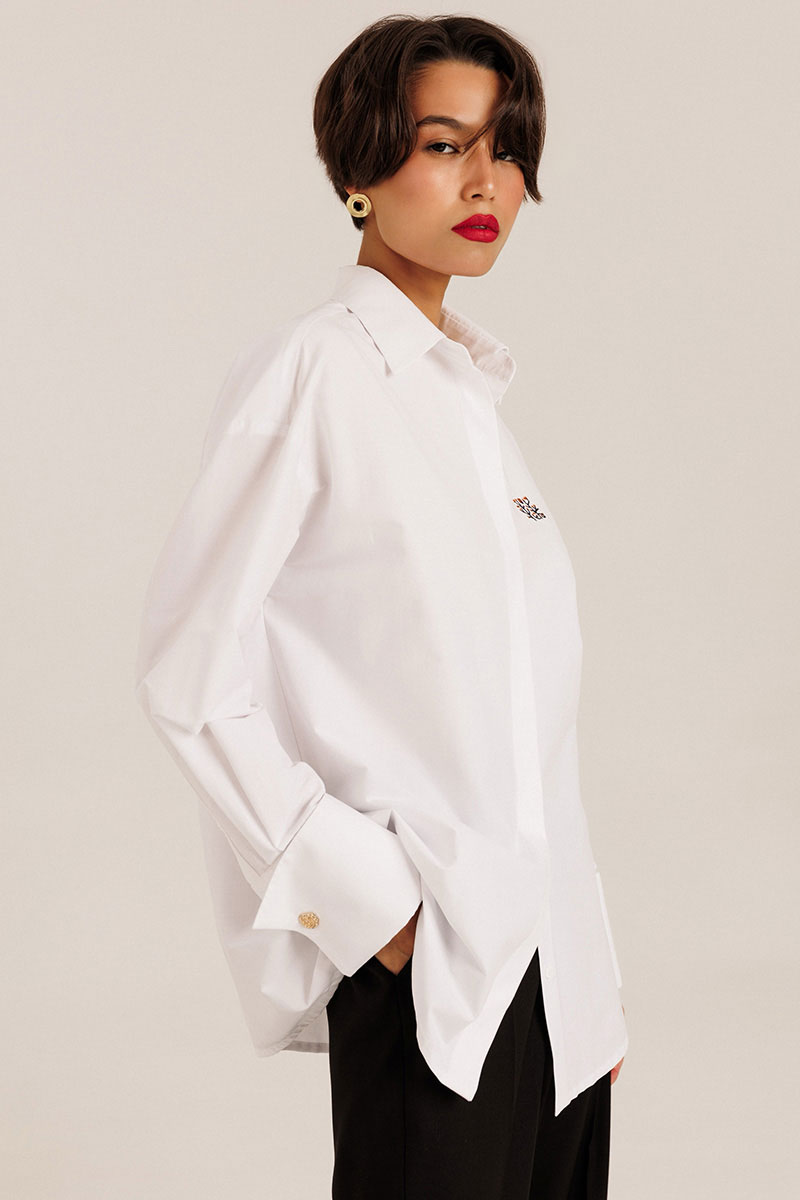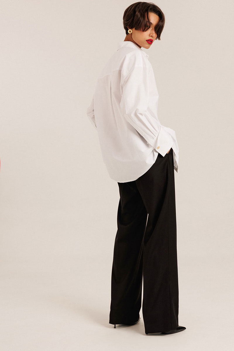 Блузка женская оверсайз прямого силуэта. Воротник отложной на стойке. Рукав спущенный с притачной широкой манжетой с отворотом. Разрез рукава обработан планкой. Застежка по переду потайная, на пробивные петли и пришивные пуговицы.