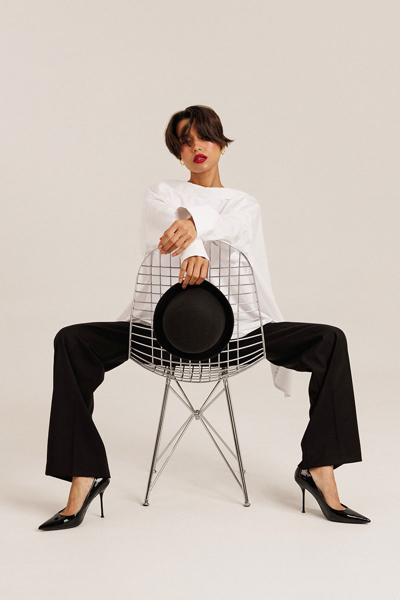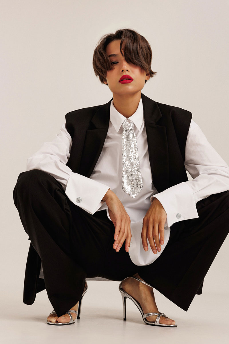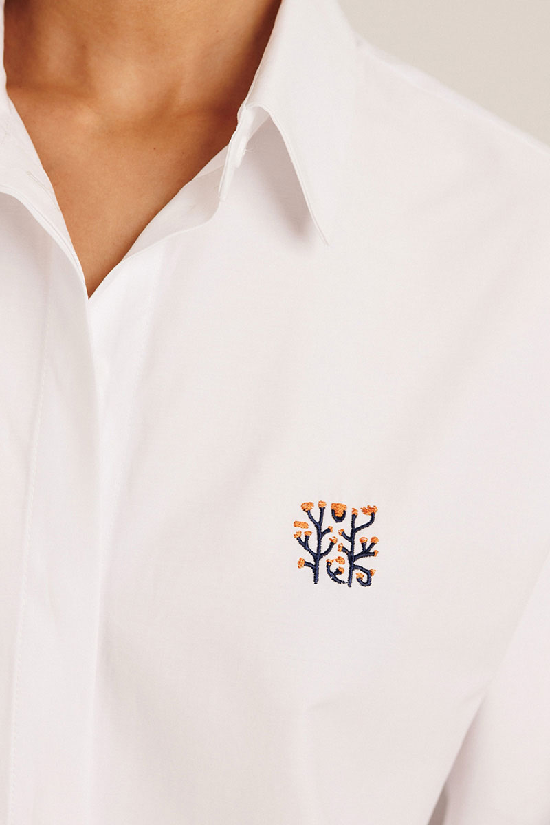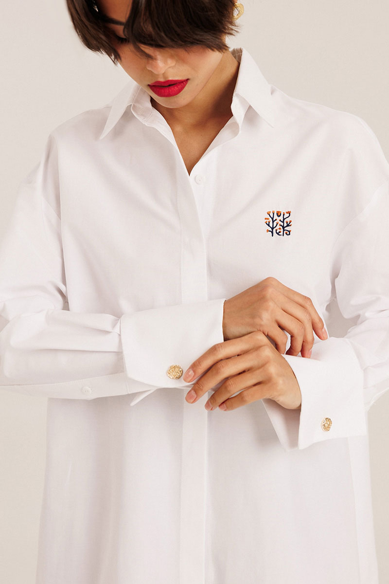 Блузка женская оверсайз прямого силуэта. Воротник отложной на стойке. Рукав спущенный с притачной широкой манжетой с отворотом. Разрез рукава обработан планкой. Застежка по переду потайная, на пробивные петли и пришивные пуговицы.