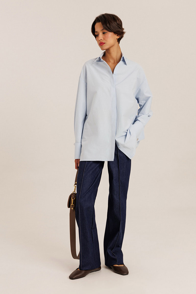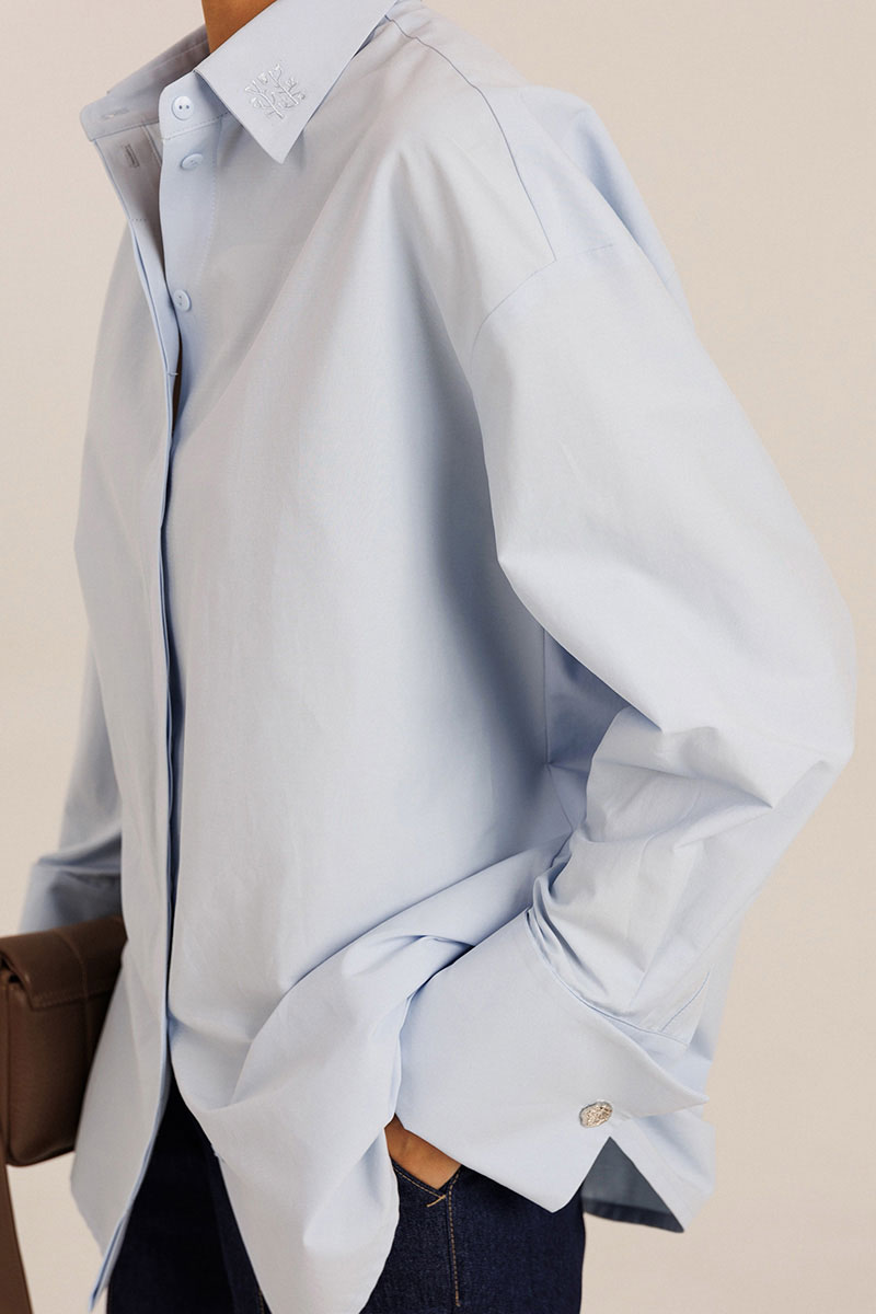 Блузка женская оверсайз прямого силуэта. Воротник отложной на стойке. Рукав спущенный с притачной широкой манжетой с отворотом. Разрез рукава обработан планкой. Застежка по переду потайная, на пробивные петли и пришивные пуговицы. Дизайнерская вышивка на воротнике.