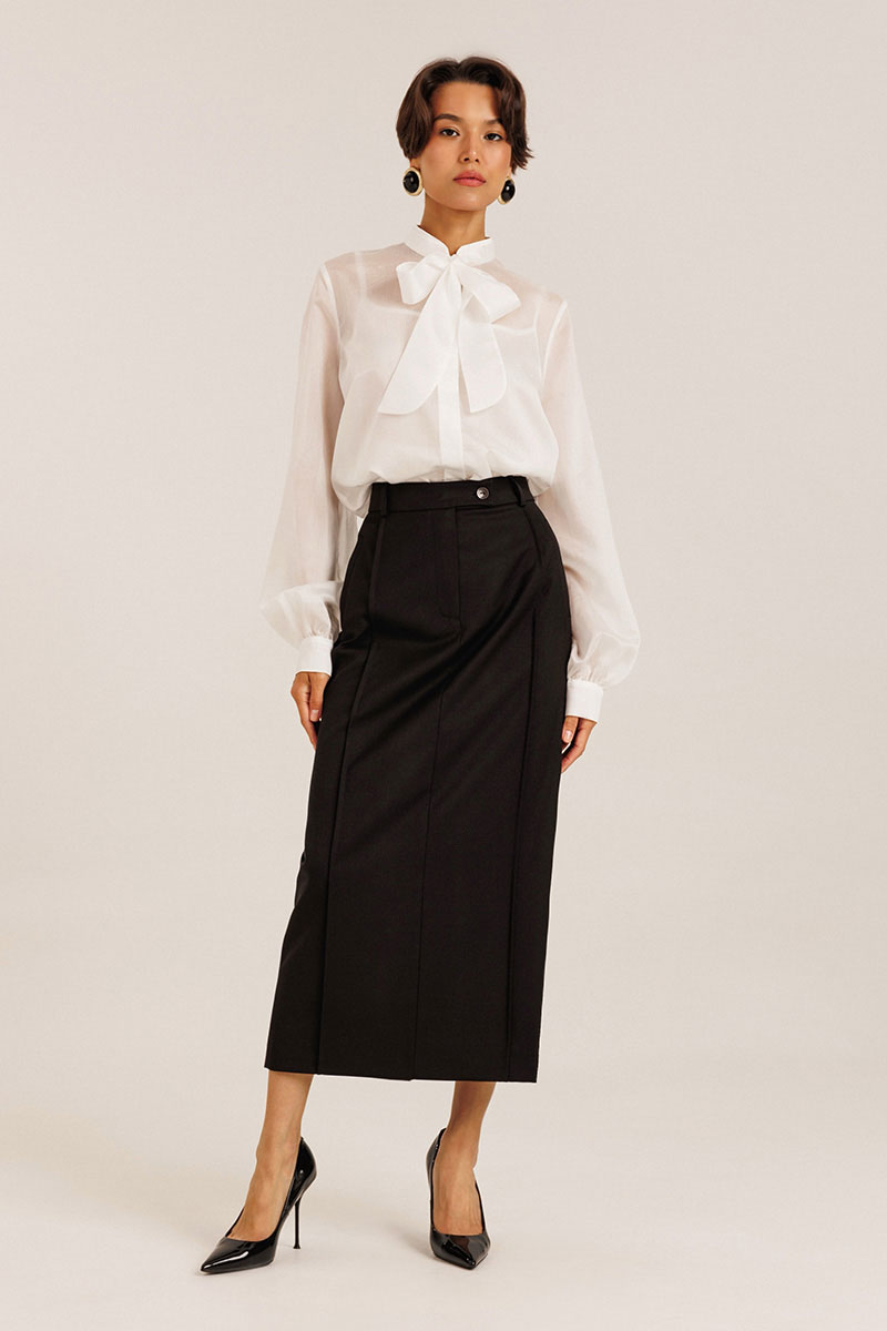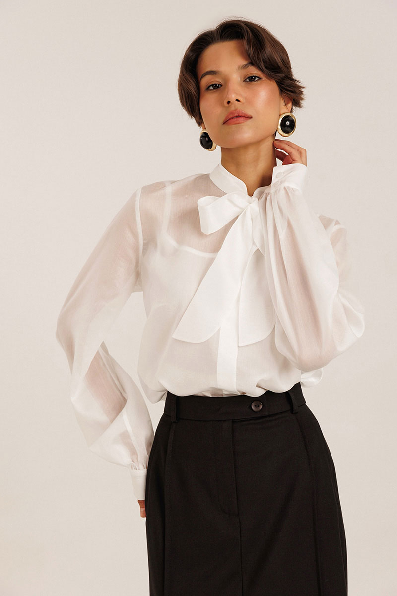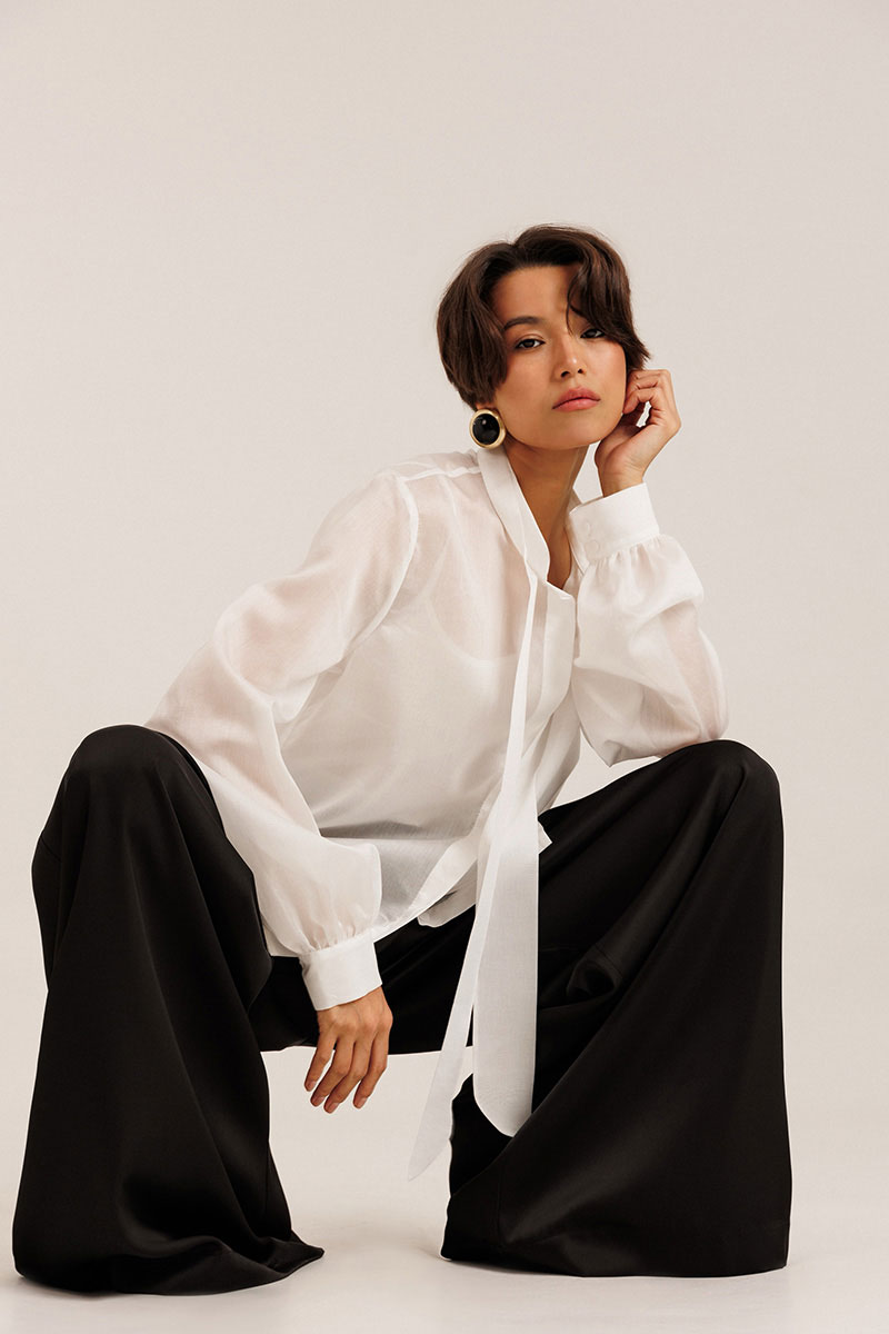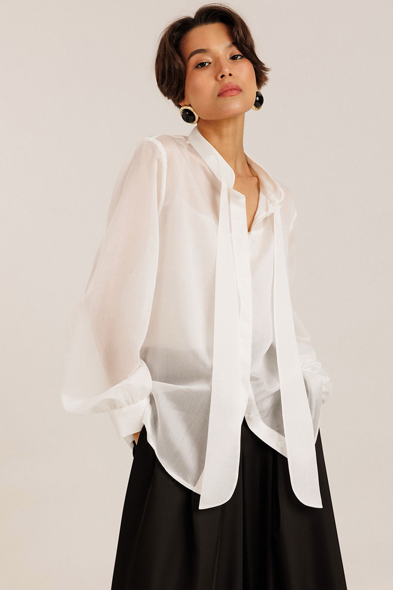 Блузка женская выполнена из полупрозрачного лиоцела. По горловине изделия выполнена стойка. Рукав длинный. Застежка потайная на пуговицах. В комплекте с блузкой идет топ на регулируемых бретелях.