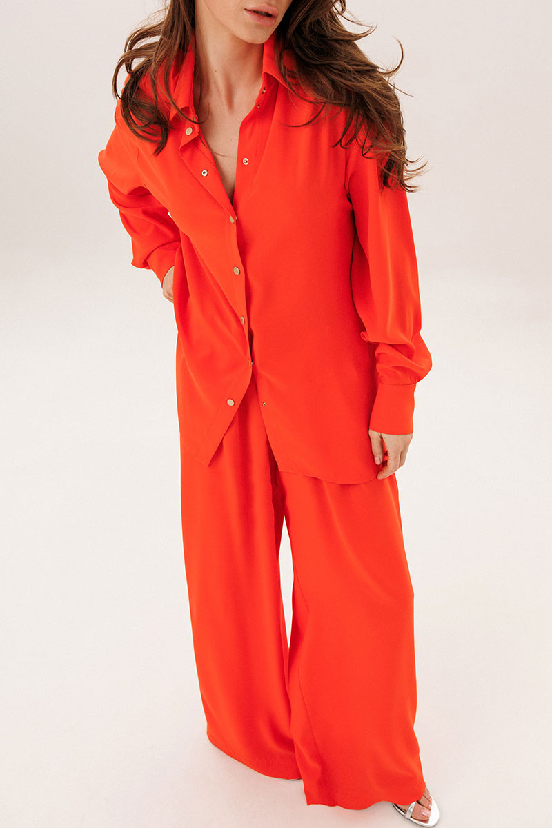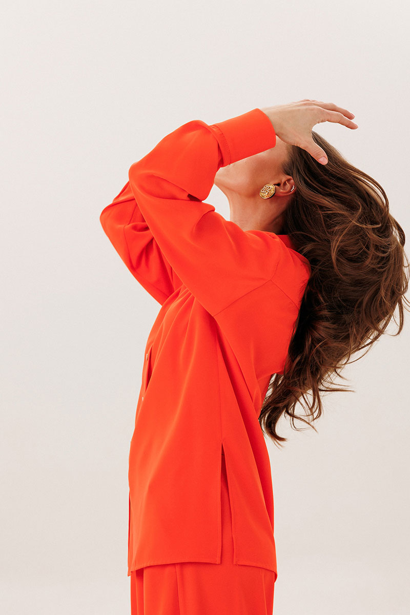 Блузка удлиненная чуть ниже бедер прямого силуэта. Воротник рубашечного типа. Рукав с манжетой на две кнопки. По боковым швам разрезы. Застежка на кнопки.