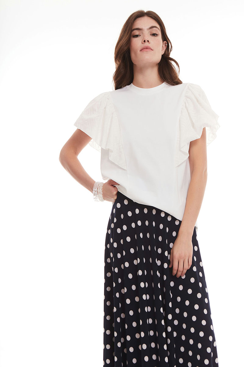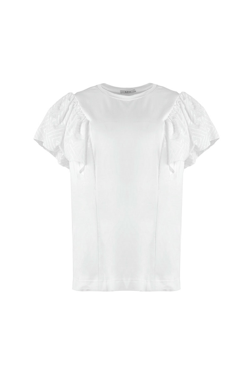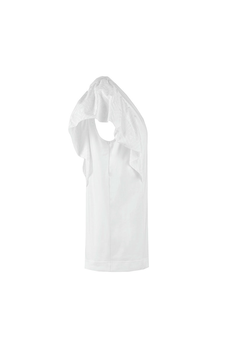 Блузка женская, прямого силуэта, без рукавов. В рельефах переда и спинки вставлены воланы из х/б ткани с вышивкой.