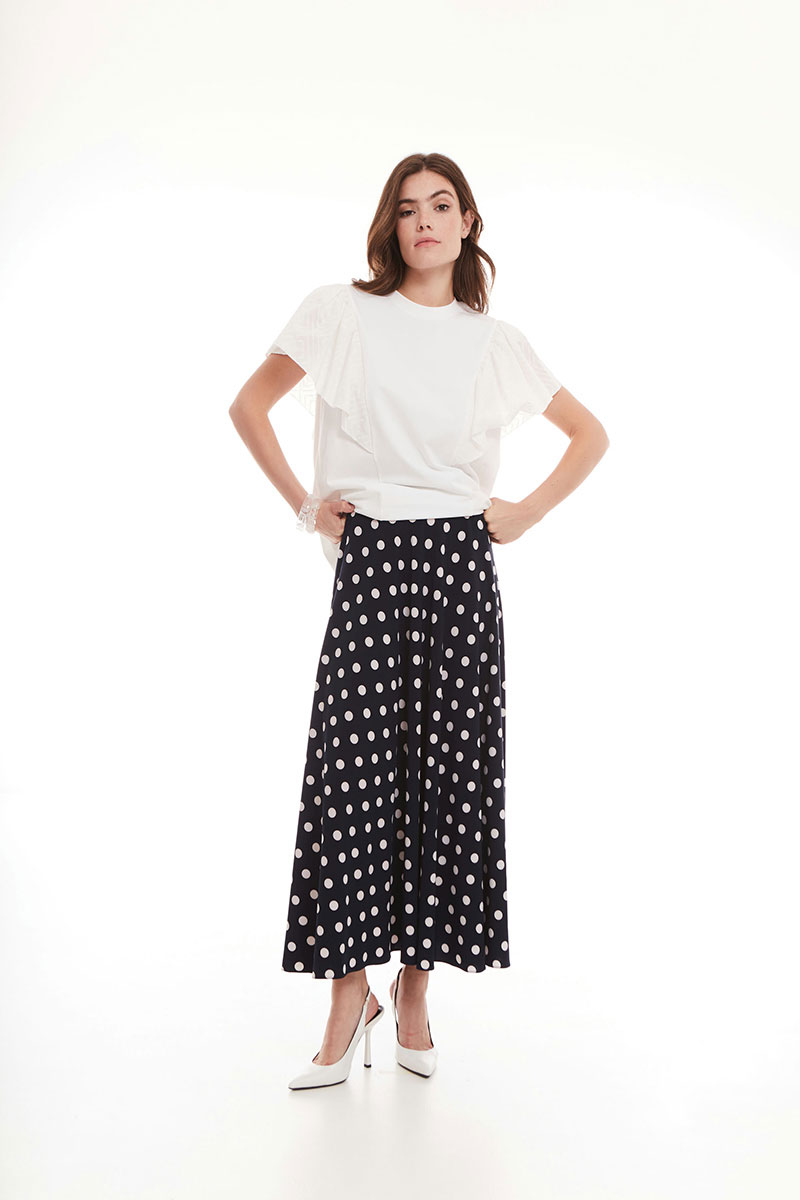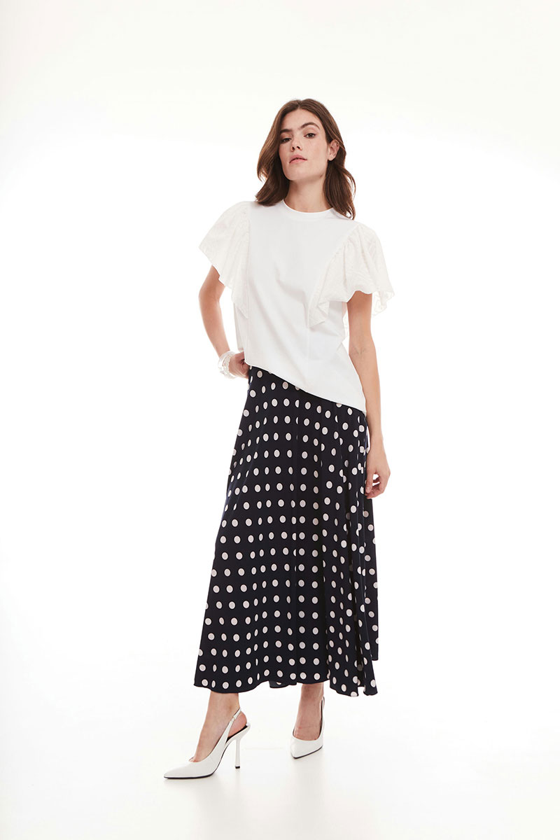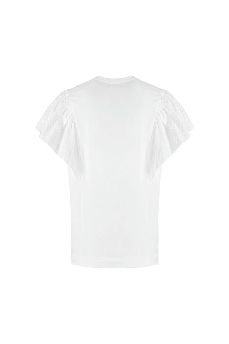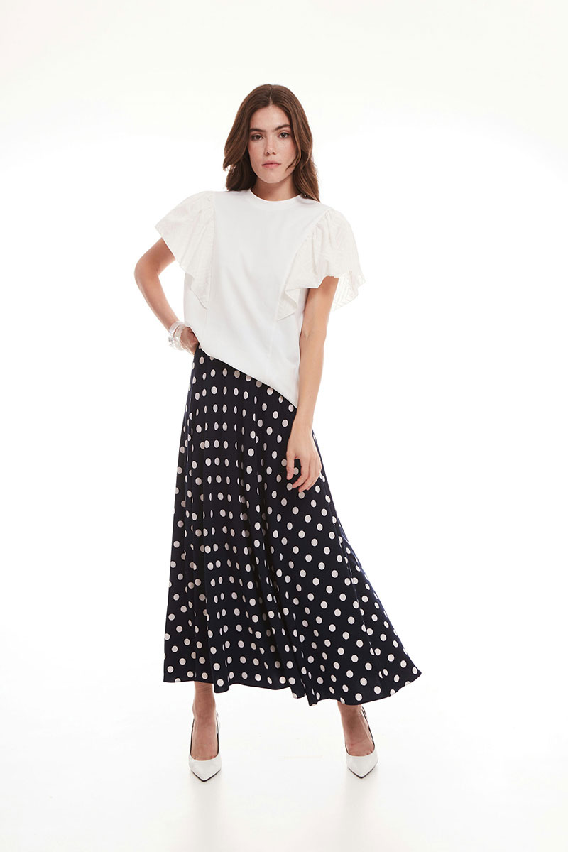 Блузка женская, прямого силуэта, без рукавов. В рельефах переда и спинки вставлены воланы из х/б ткани с вышивкой.