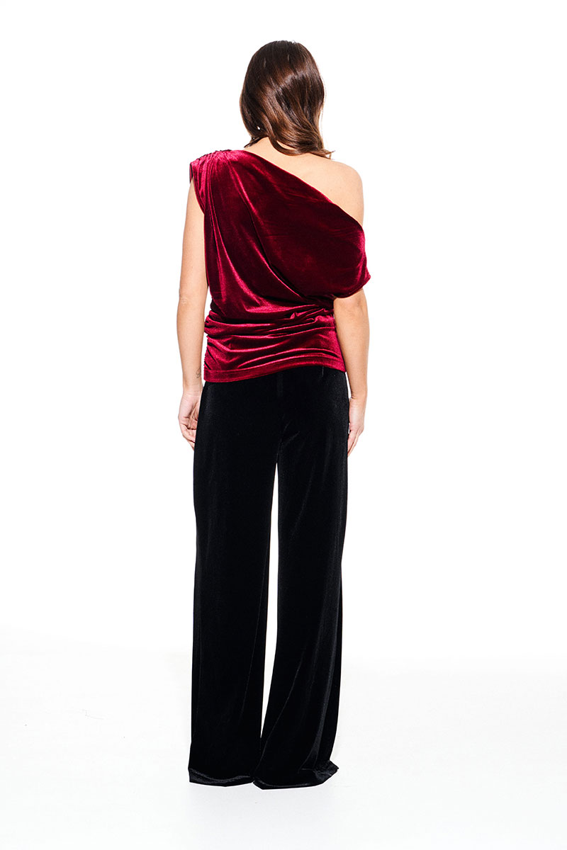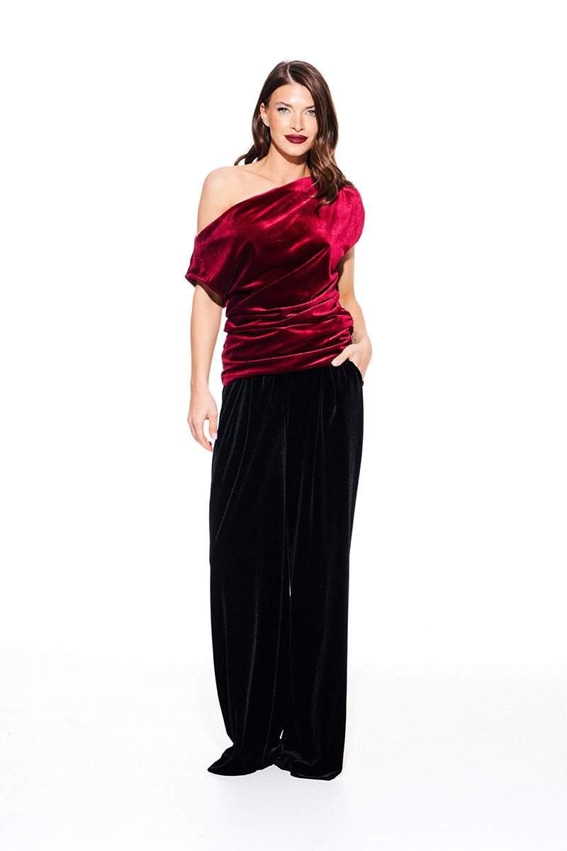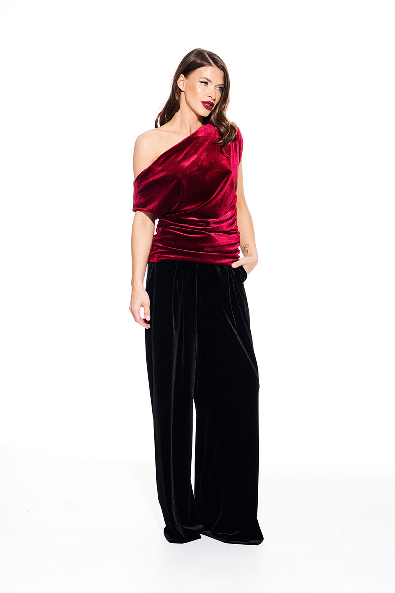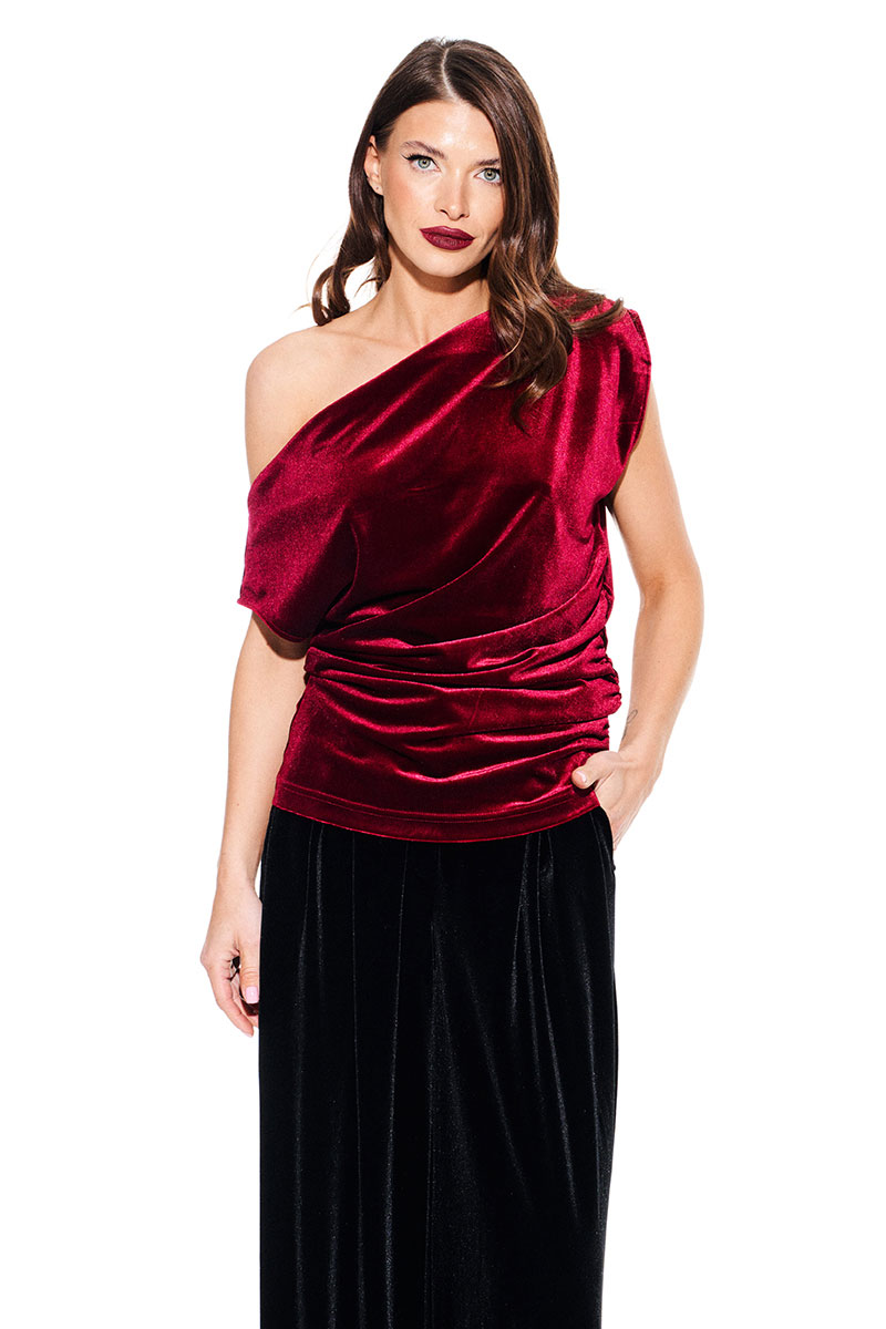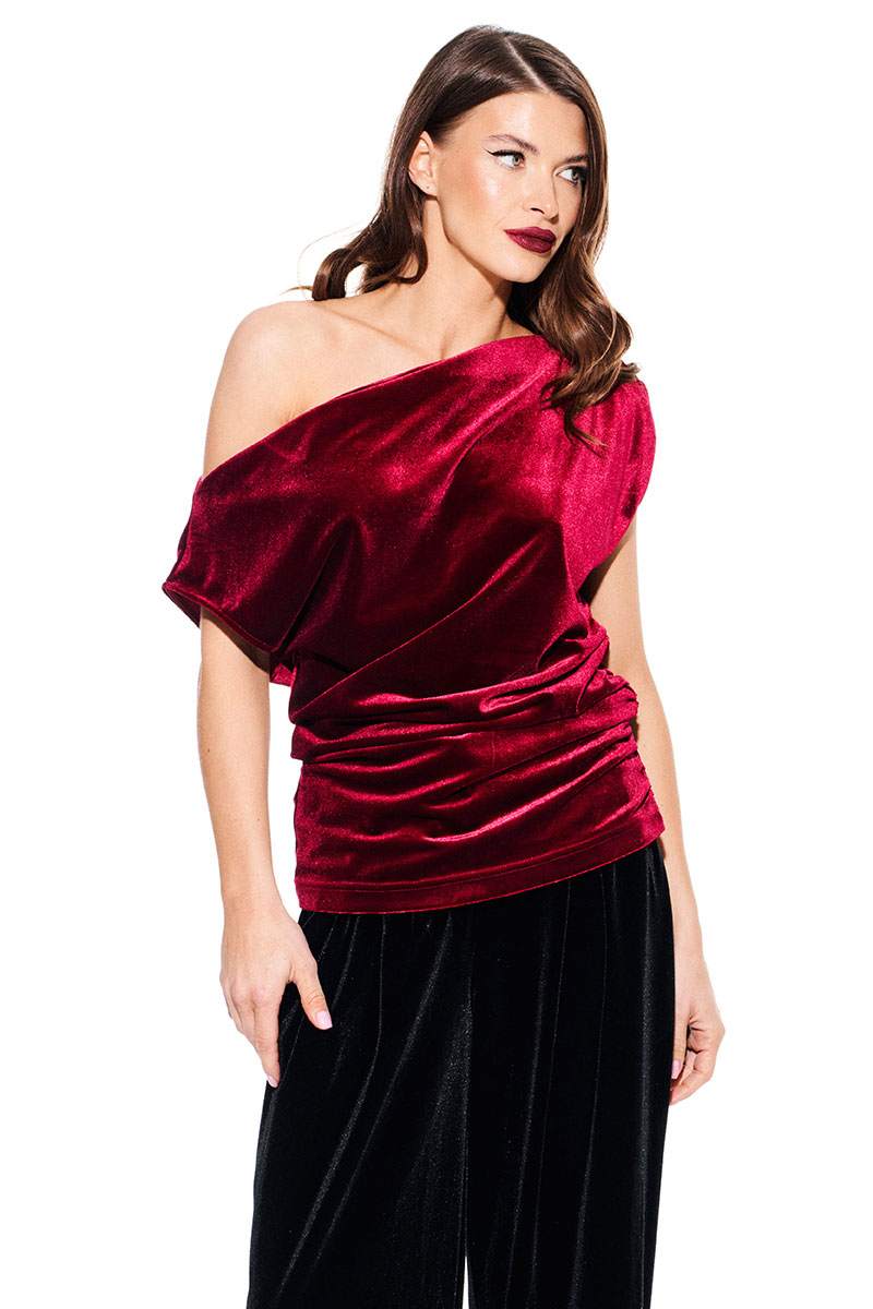 Блуза из бархата на трикотажной основе, умеренного объема, полуприлегающего силуэта с акцентом на одно плечо, с фигурной драпировкой на уровне груди. Вырез горловины в форме лодочки. Левый плечевой и боковой шов оформлены сборкой. Длина до линии бедер.