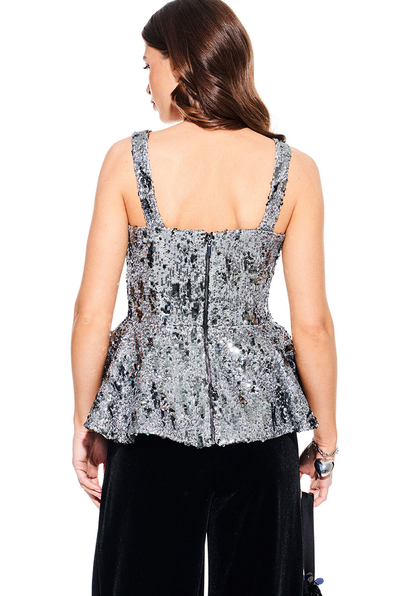 Блузка из трикотажного полотна в пайетки, приталенного силуэта, отрезная на уровне линии талии, на широких бретелях, на подкладке. Перед с отрезной кокеткой, рельефами и нагрудными вытачками. Спинка с рельефами, со средним швом и застежкой на тесьму-молнию. Нижняя часть блузки расклешенная.