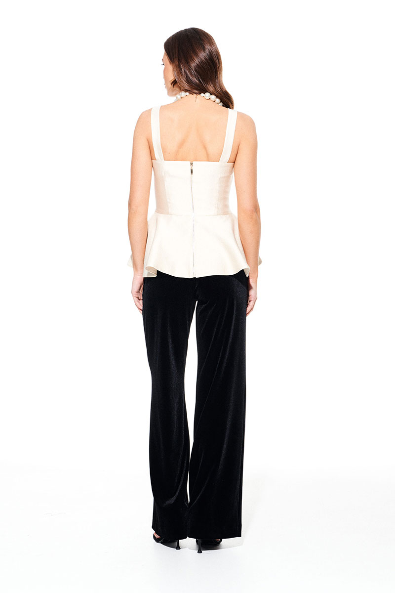 Блузка приталенного силуэта, отрезная на уровне линии талии, на широких бретелях, на подкладке. Перед с отрезной кокеткой, рельефами и нагрудными вытачками. Спинка с рельефами, со средним швом и застежкой на тесьму-молнию. Нижняя часть блузки расклешенная.