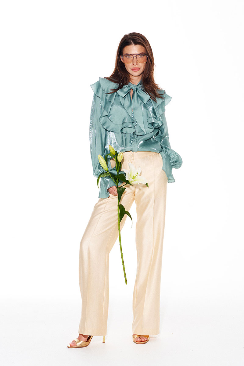 Блузка умеренного объема, прямого силуэта, с центральной застежкой на навесные петли и пуговицы. Воротник с отрезной стойкой, переходящий в завязки. Горловина переда оформлена V-образным вырезом. Детали переда с рельефами, оформленные воланами. Спинка цельная. Рукав покроя реглан. Нижний срез рукава обработан воланом и собран на резинку.
