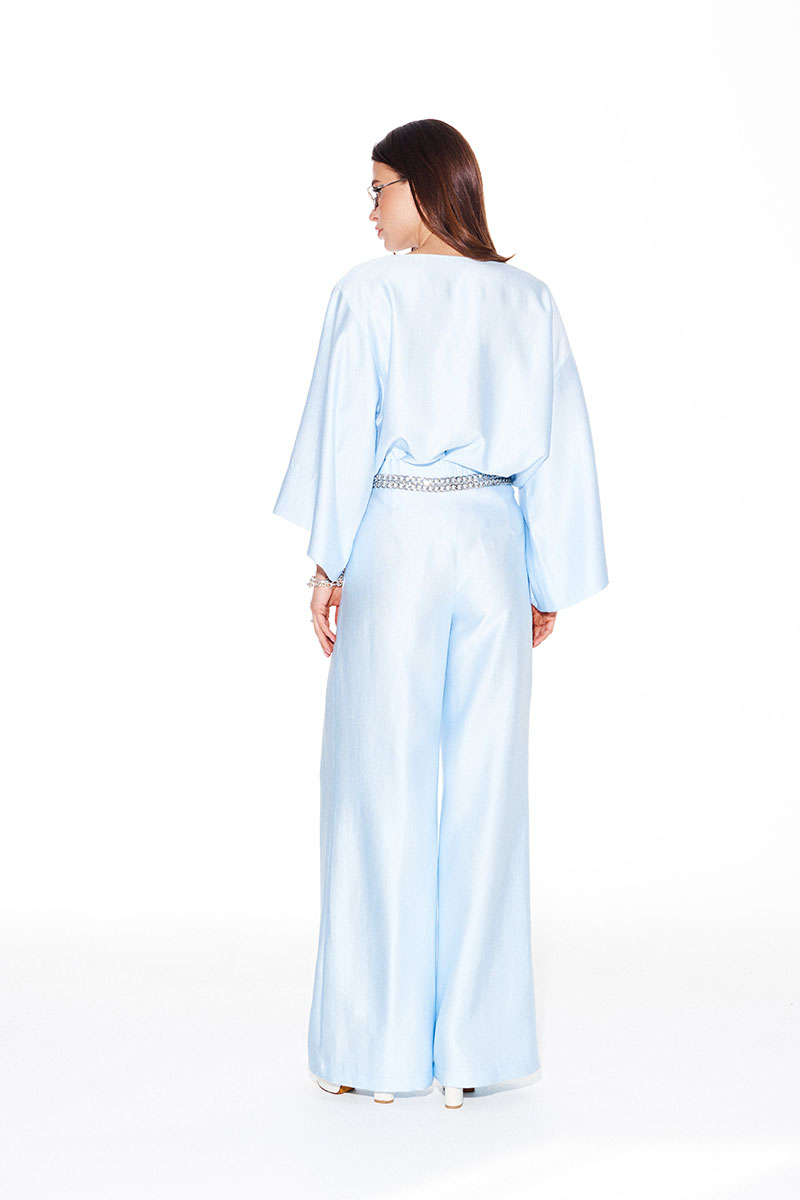 Блузка из костюмно-плательной ткани, свободного объема, прямого силуэта, с круглым вырезом горловины. Перед с нагрудными вытачками. Спинка цельная. Боковые швы заканчиваются разрезами. Рукав 3/4, втачной, одношовный, широкий.