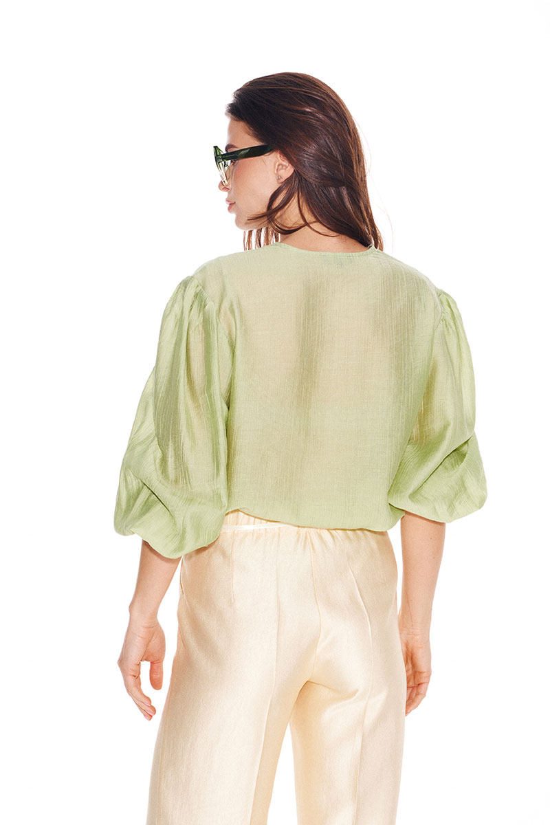 Блузка умеренного объема, прямого силуэта, с центральной застежкой на петли и пуговицы. Горловина переда с V-образным вырезом. Детали переда с нагрудными вытачками. Спинка цельная. Боковые швы заканчиваются разрезами. Рукав 3/4, втачной, одношовный, со сборкой по верхнему и нижнему срезам. Нижний срез рукава оформлен притачной манжетой со сборкой на резинку.