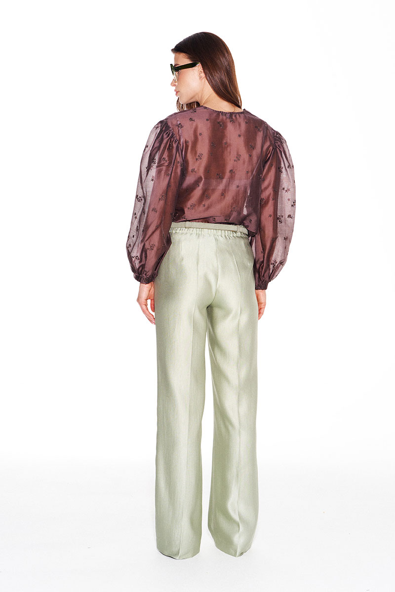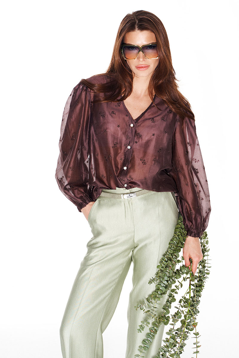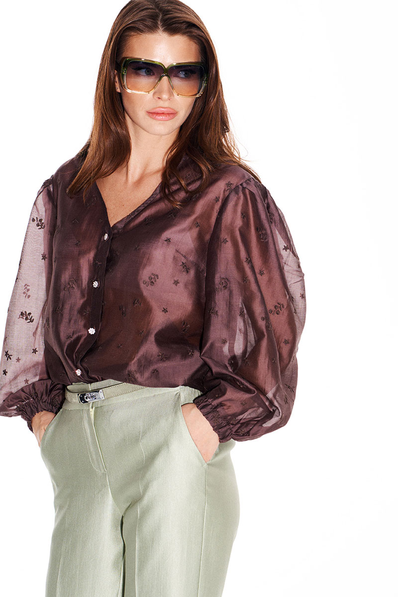 Блузка умеренного объема, прямого силуэта, с центральной застежкой на петли и пуговицы. Горловина переда с V-образным вырезом. Детали переда с нагрудными вытачками. Спинка цельная. Боковые швы заканчиваются разрезами. Рукав 3/4, втачной, одношовный, со сборкой по верхнему и нижнему срезам. Нижний срез рукава оформлен притачной манжетой со сборкой на резинку.