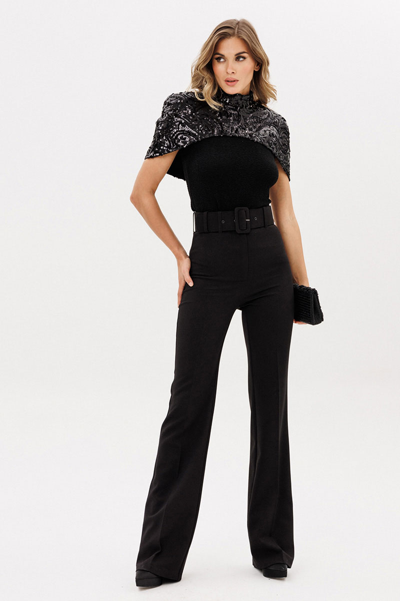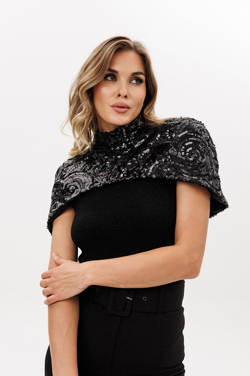 Кейп (накидка) выполнен из сетки с вышивкой с пайетками. Кейп прямого силуэта, длиной до линии груди. Перед цельный. Низ переда фигурной формы. Застежка на молнию с металлическими звеньями сзади в среднем шве спинки. Воротник-стойка. Кейп на притачной по низу подкладке из атласа, кейп с плечевыми накладками.