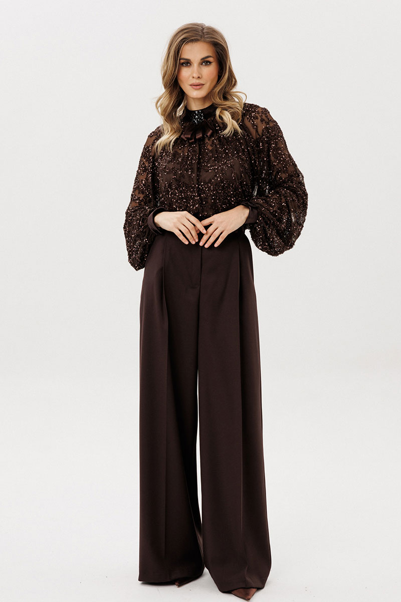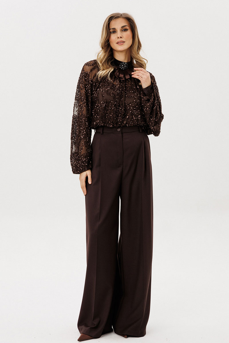 Блузка + топ. Блузка выполнена из сетки с вышивкой пайетками. Блузка прямого силуэта, длиной до линии бедер. Перед и спинка цельные, со сборкой по горловине. Воротник-стойка. Застежка сзади на две петли и пуговицы. Рукав покроя "реглан", одношовный, со сборкой по горловине и низу. Низ рукава на притачной манжете из велюра, застегивающейся на пуговицу. В комплект входит топ из трикотажной подкладки. Топ прямого силуэта, длиной до линии бедер, бретели регулируются по длине. В комплект входит декоративная брошь.