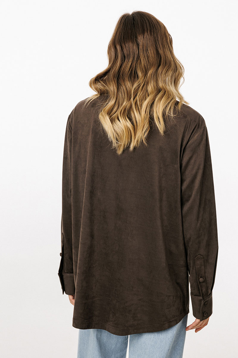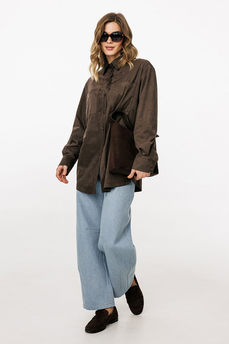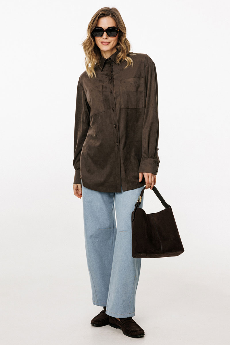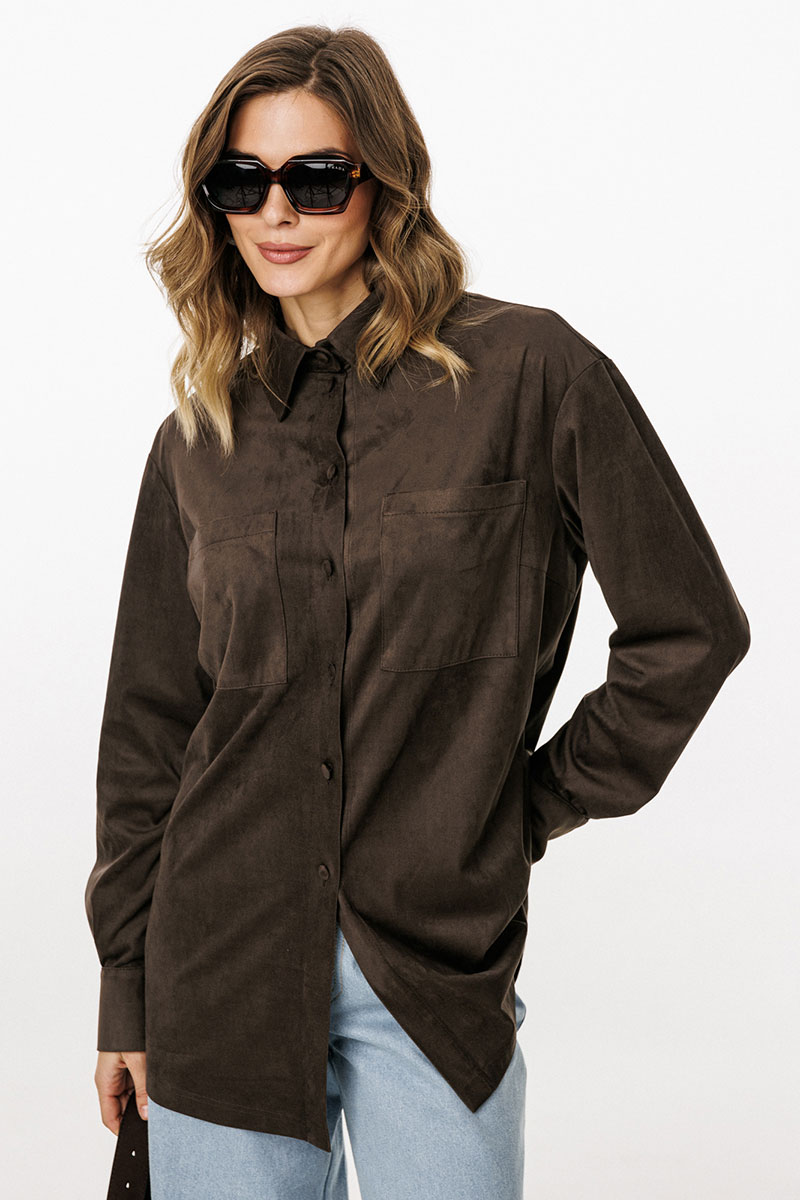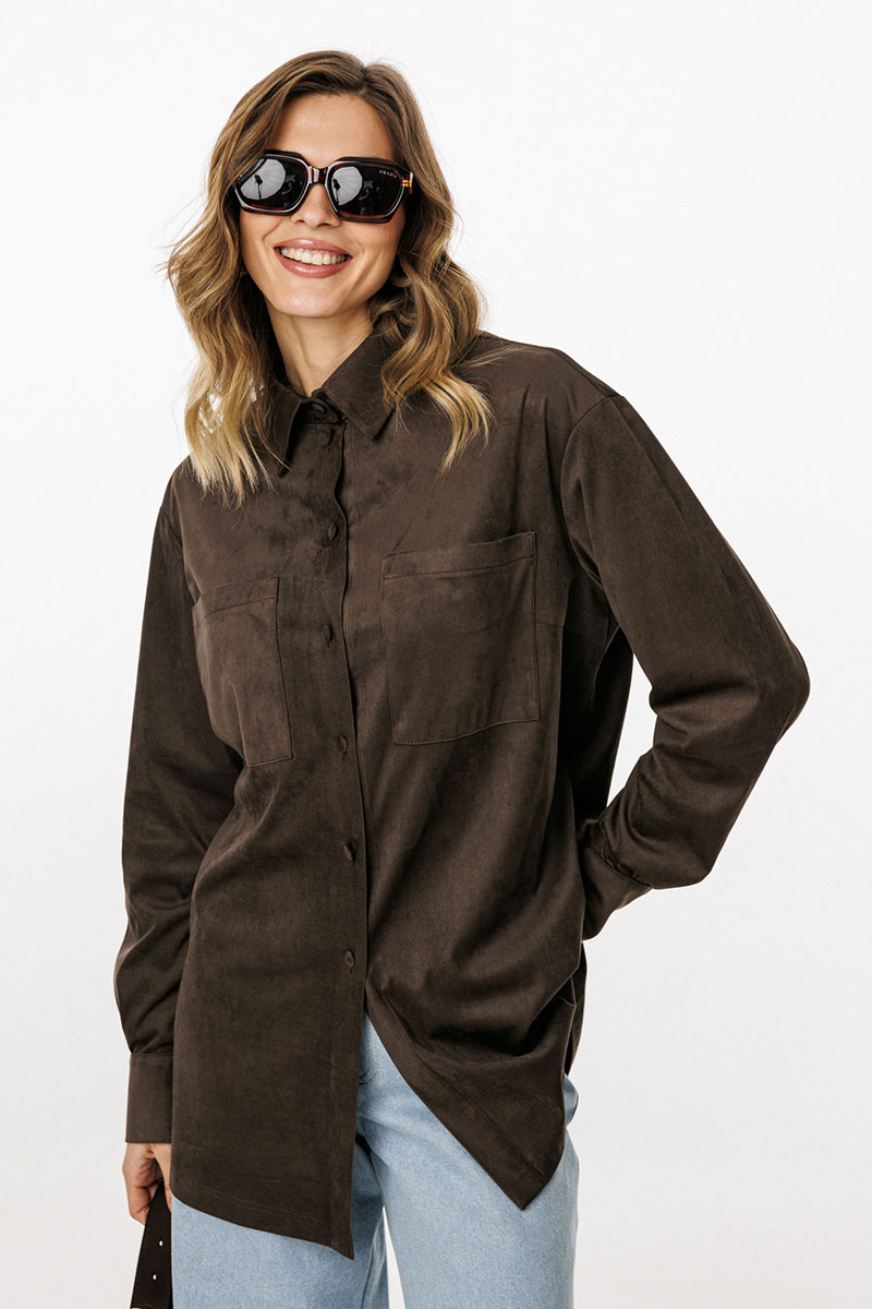 Блузка выполнена из тонкой искусственной замши. Блузка прямого силуэта, длиной до линии бедер. Спереди нагрудные карманы и центральная застежка с планкой на пуговицы. Спинка цельная. Воротник стояче-отложной с отрезной стойкой. Рукав втачной, одношовный. Низ рукава на притачной манжете с застежкой на пуговицы. Низ блузки фигурной формы.