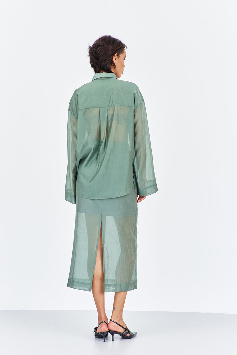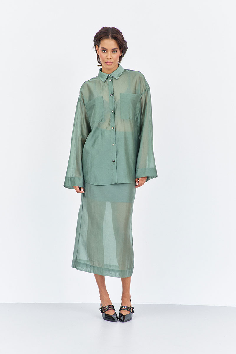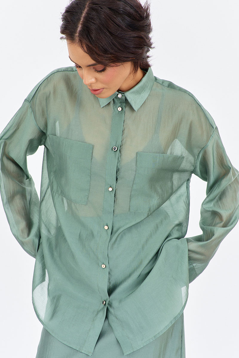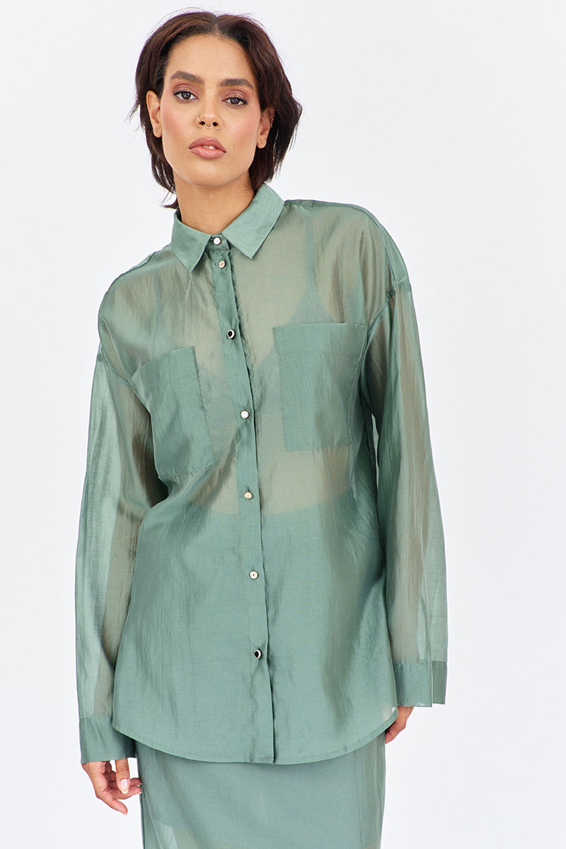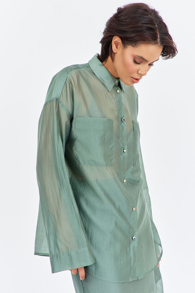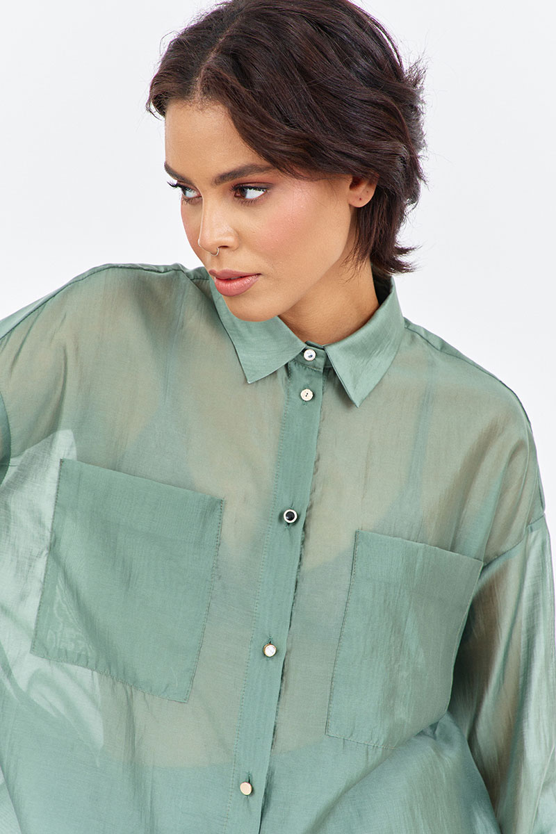 Блузка свободного силуэта с декоративными карманами по переду. Характеристики: выполнена из блузочной ткани в цвете зеленый мох, центральная застежка на петли и пуговицы, по переду карманы, по спинке отрезная кокетка.