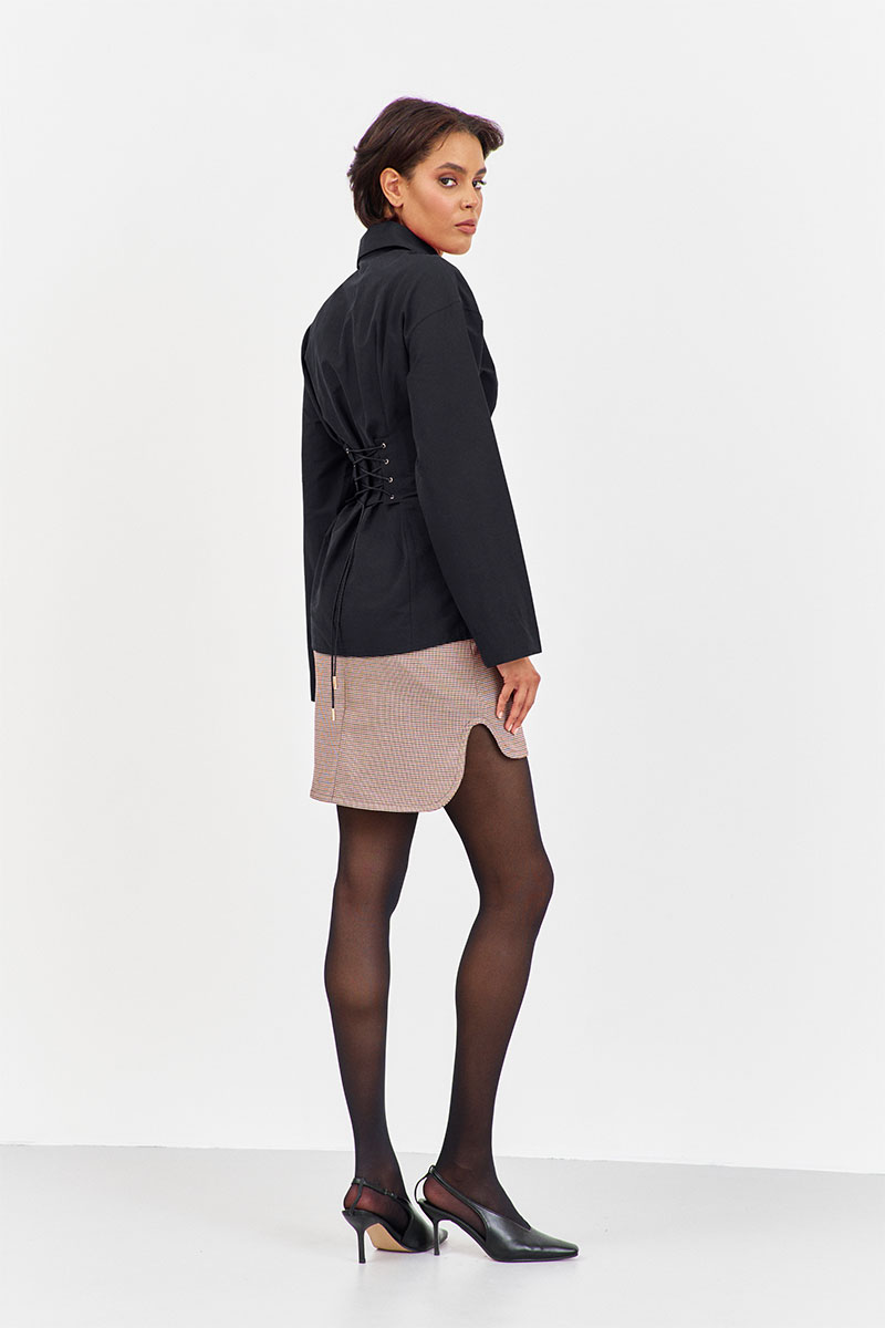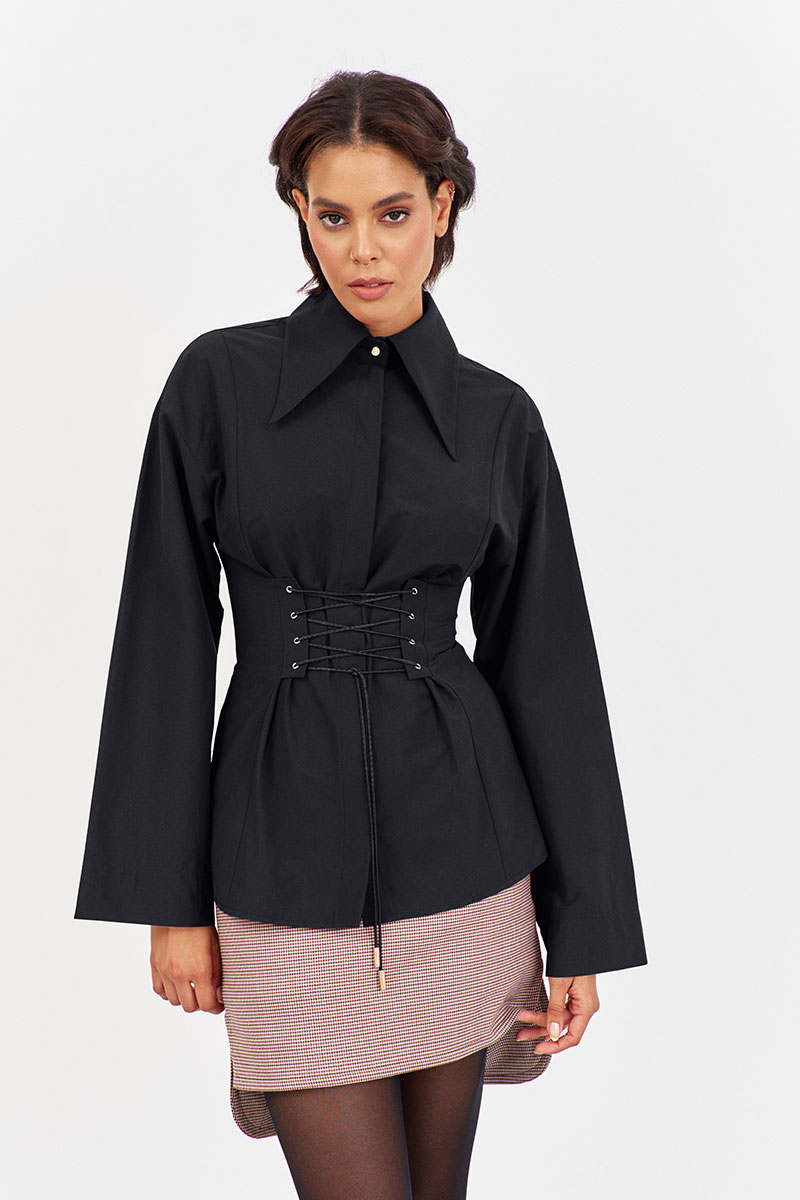 Блузка приталенного силуэта с декоративной шнуровкой по переду и спинке. Характеристики: выполнена из блузочной ткани в черном цвете, центральная застежка на петли и пуговицы, по переду и спинке декоративная шнуровка, воротник рубашечного типа, спущенное плечо.