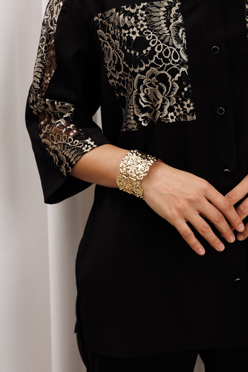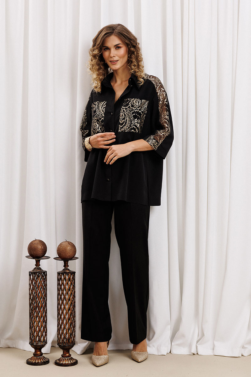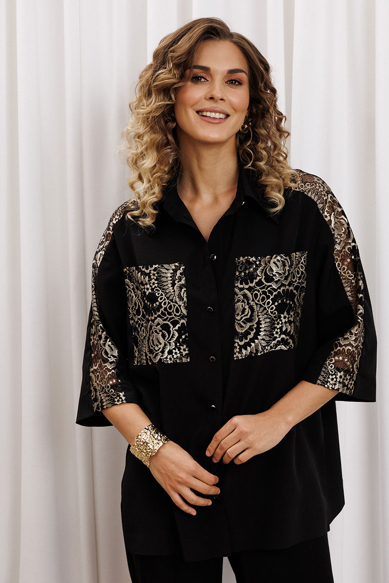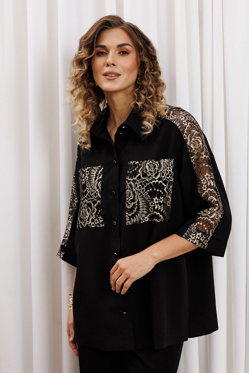 Рубашка свободного силуэта из блузочного крепа. Застежка центральная на петли и пуговицы, воротник на стойке. В боковых швах разрезы. Рукав втачной рубашечного кроя. Карманы спереди и вставка вдоль плеча и рукава выполнеы из кружева.