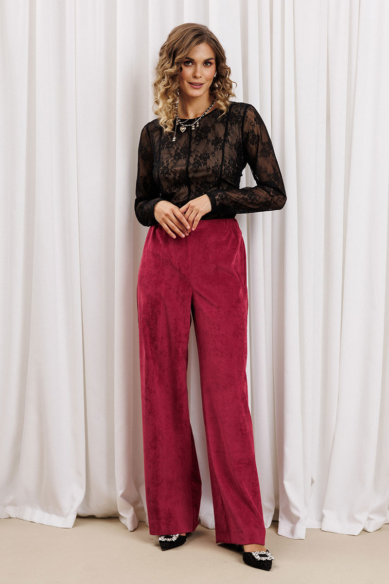 Брюки палаццо с притачным поясом из мягкой вельветовой ткани. Спереди застежка гульфик на молнии и петлей и пуговицей по поясу. По задней частям брюк вытачки. Пояс с резинкой в боковых частях. Брюки с заутюженными стрелками.