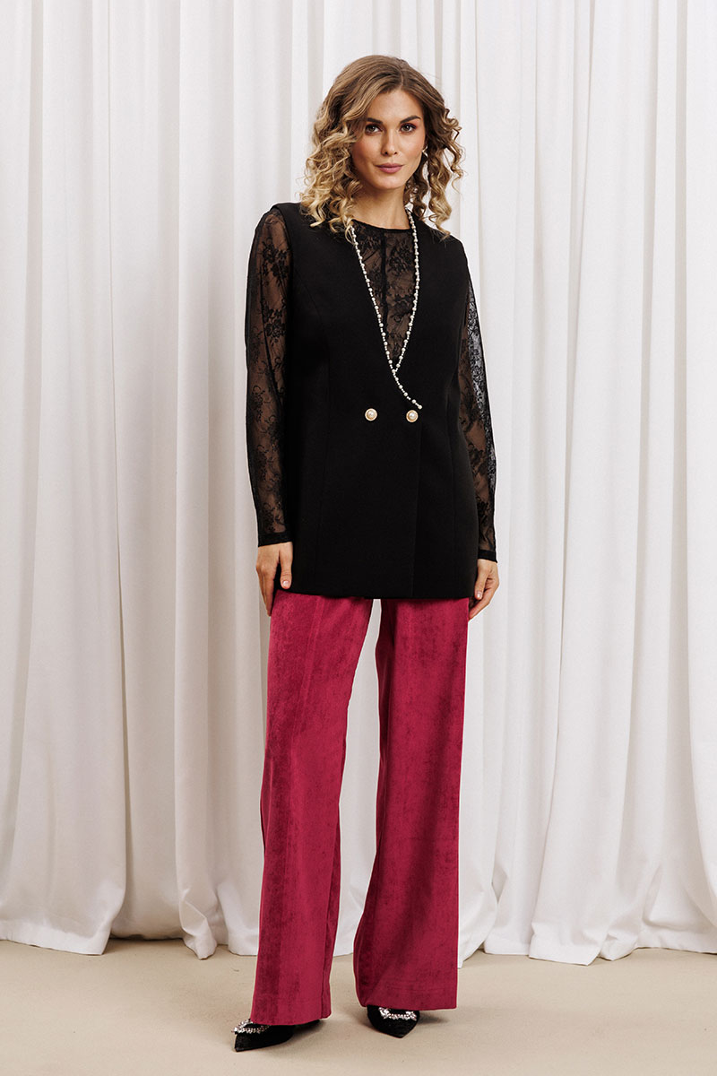 Блузка приталенного силуэта из кружевной сетки. Перед и спинка с рельефами и средним швом. Рукав втачной. Перед и спинка на телесной подкладке.